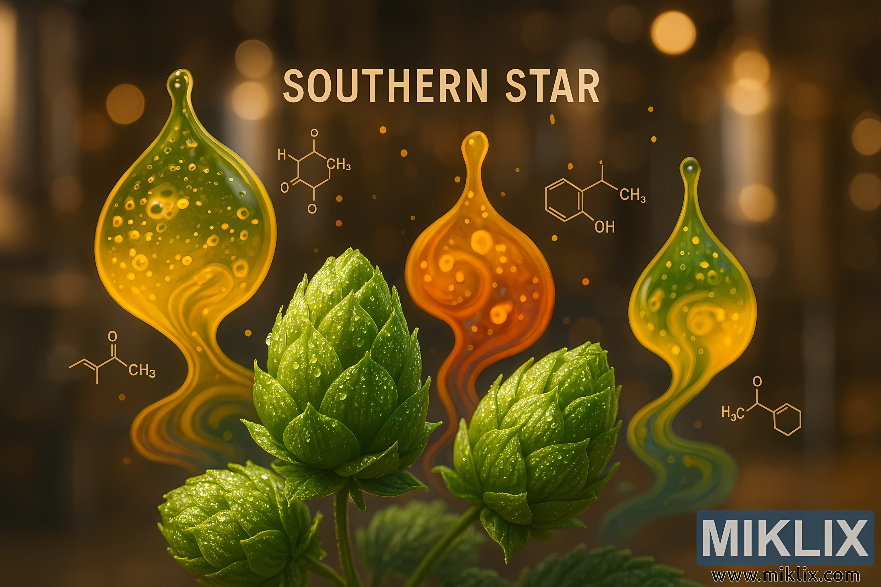 ചിത്രത്തിന്റെ മുകളിൽ സൂക്ഷ്മമായ തന്മാത്രാ രേഖാചിത്രങ്ങളും രാസ ചിഹ്നങ്ങളും ഉണ്ട്, അവ ഹോപ്പ് രസതന്ത്രത്തിന്റെ ശാസ്ത്രീയ അടിത്തറയെ സൂചിപ്പിക്കുന്നതിന് നേർത്ത വെളുത്ത വരകളിൽ വരച്ചിരിക്കുന്നു. അവശ്യ എണ്ണകൾക്ക് മുകളിൽ, "SOUTHERN STAR" എന്ന ലേബൽ ബോൾഡ്, വലിയക്ഷര വെളുത്ത വാചകത്തിൽ ദൃശ്യമാകുന്നു, ഇത് ഘടനയെ ഉറപ്പിക്കുകയും വൈവിധ്യമാർന്ന ഫോക്കസിനെ ശക്തിപ്പെടുത്തുകയും ചെയ്യുന്നു.