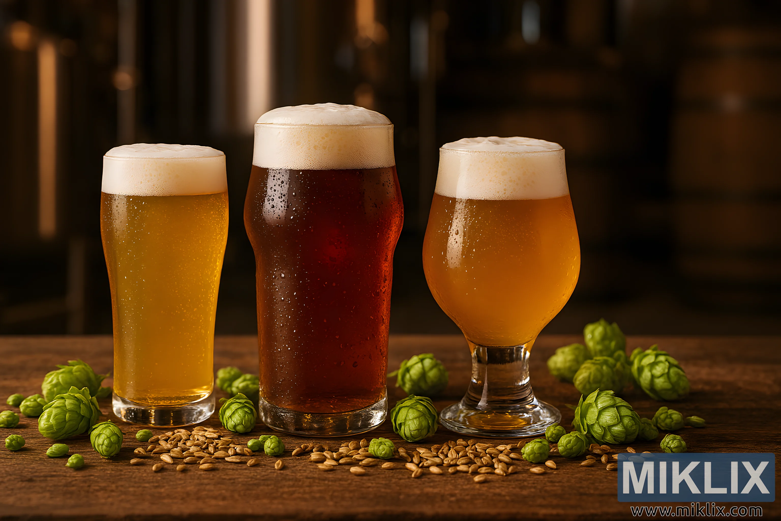മങ്ങിയ പശ്ചാത്തലത്തിൽ, സ്റ്റെയിൻലെസ് സ്റ്റീൽ ബ്രൂവിംഗ് ഉപകരണങ്ങളും മര ബാരലുകളും പ്രവർത്തിക്കുന്ന ഒരു ബ്രൂവറിയുടെ ഉൾവശം അനുസ്മരിപ്പിക്കുന്നു. ഊഷ്മളവും അന്തരീക്ഷം നിറഞ്ഞതുമായ ലൈറ്റിംഗ്, രംഗമാകെ ഒരു സ്വർണ്ണ തിളക്കം വീശുകയും സ്വാഗതാർഹവും സുഖകരവുമായ അന്തരീക്ഷം സൃഷ്ടിക്കുകയും ചെയ്യുന്നു. വെളിച്ചത്തിന്റെയും നിഴലിന്റെയും ഇടപെടൽ ഫീൽഡിന്റെ ആഴം വർദ്ധിപ്പിക്കുന്നു, സ്ഥലബോധം നിലനിർത്തിക്കൊണ്ട് ബിയറുകളിലേക്കും ചേരുവകളിലേക്കും ശ്രദ്ധ ആകർഷിക്കുന്നു.