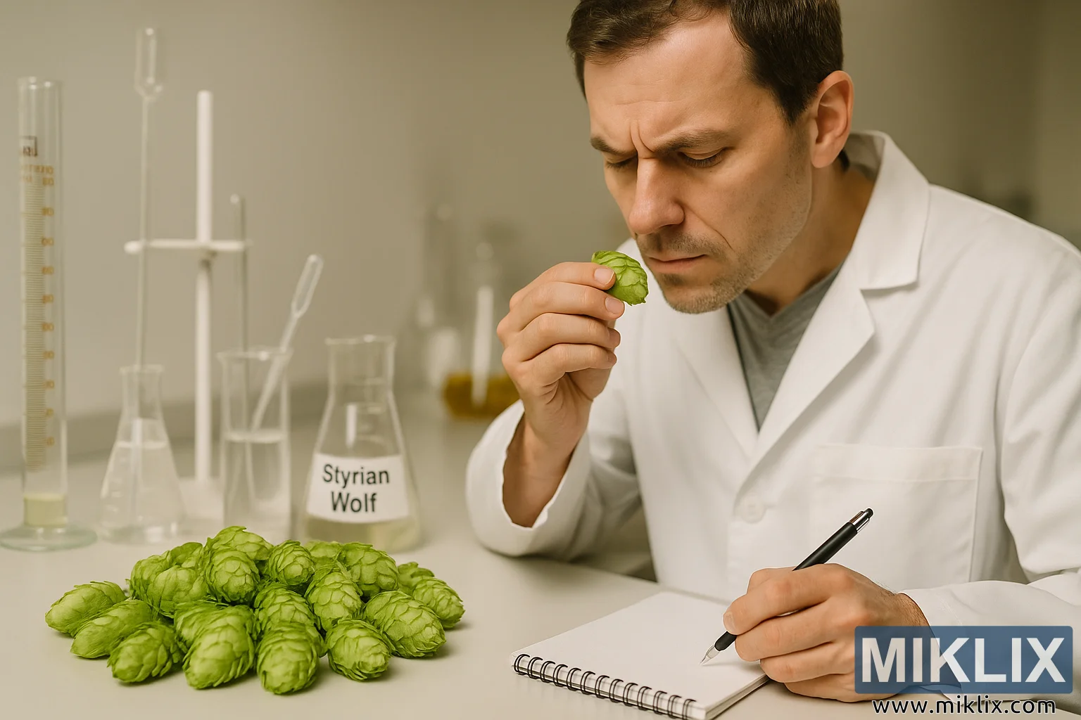 വെളുത്ത ലാബ് കോട്ട് ധരിച്ച ഒരു സെൻസറി സയന്റിസ്റ്റ്, ബീക്കറുകളും വിശകലന ഉപകരണങ്ങളും ഉപയോഗിച്ച് ഒരു പ്രൊഫഷണൽ ലബോറട്ടറിയിൽ സ്റ്റൈറിയൻ വുൾഫ് ഹോപ്പുകളുടെ സുഗന്ധം വിലയിരുത്തുന്നു.