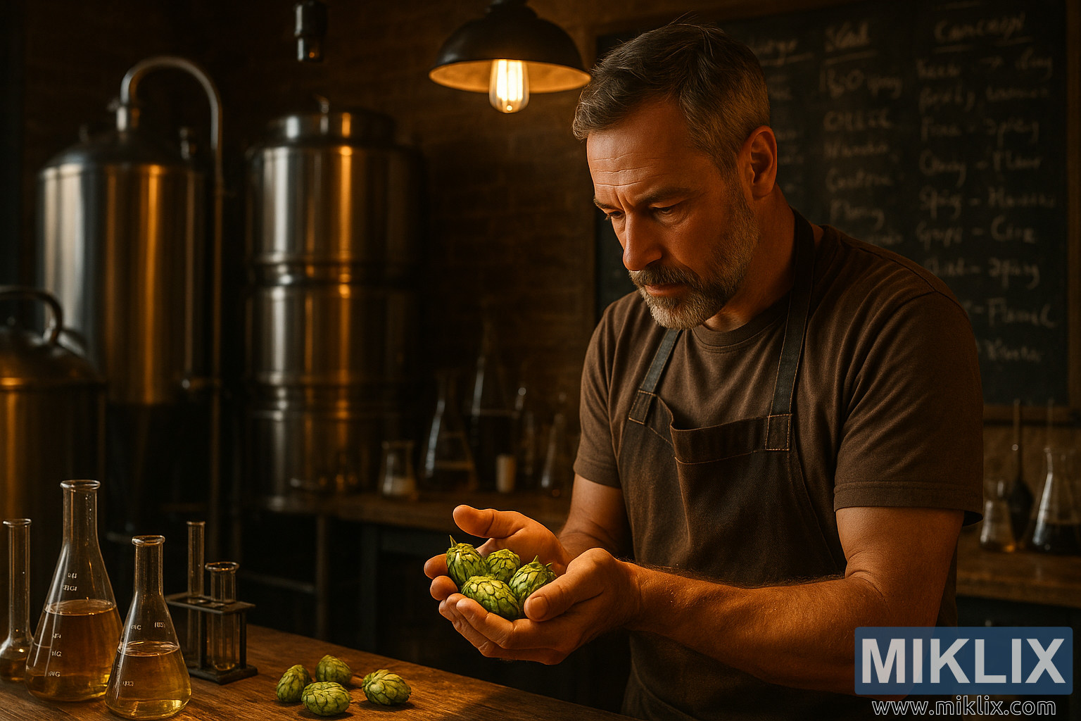 സ്റ്റെയിൻലെസ് കെറ്റിലുകൾ, ടാങ്കുകൾ, കുറിപ്പുകൾ എന്നിവയ്ക്ക് സമീപം ടോപസ് ഹോപ്സ് പരിശോധിക്കുന്ന ഒരു സുഖപ്രദമായ ബ്രൂവറി വർക്ക്ഷോപ്പ്, കരകൗശല വൈദഗ്ധ്യവും പാചകക്കുറിപ്പ് വികസനവും എടുത്തുകാണിക്കുന്നു.