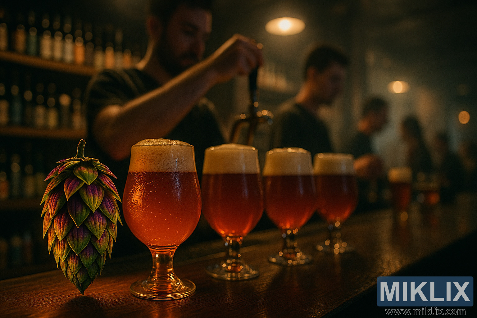 ആംബർ ക്രാഫ്റ്റ് ബിയറുകൾ, തിളങ്ങുന്ന വിക് സീക്രട്ട് ഹോപ്പ് കോണുകൾ, മങ്ങിയ ബാർടെൻഡറുകൾ, കുപ്പികളുടെ മങ്ങിയ ഷെൽഫുകൾ എന്നിവ ഉൾക്കൊള്ളുന്ന ഊഷ്മളവും അന്തരീക്ഷപരവുമായ ഒരു ബാർ രംഗം.