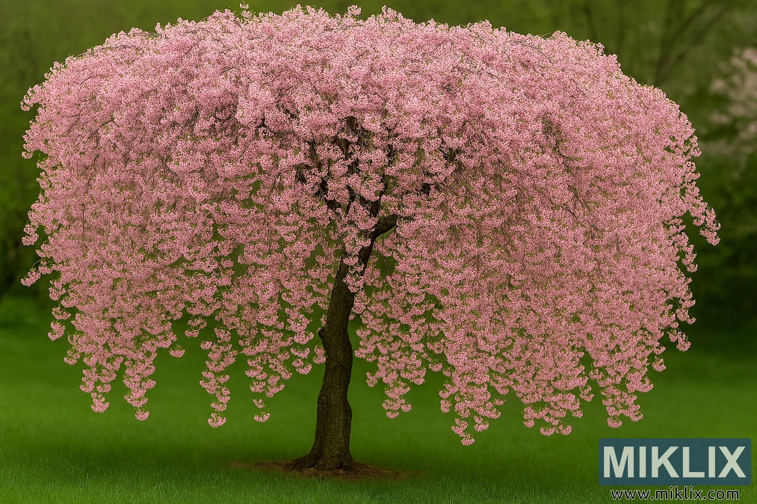 വസന്തകാലത്ത് സുബിർട്ടെല്ല റോസ വീപ്പിംഗ് ചെറി മരത്തിന്റെ ഉയർന്ന റെസല്യൂഷനുള്ള ലാൻഡ്സ്കേപ്പ് ചിത്രം, മൃദുവായ പിങ്ക് പൂക്കളാൽ മൂടപ്പെട്ട തൂങ്ങിക്കിടക്കുന്ന ശാഖകൾ ഊർജ്ജസ്വലമായ പച്ച പുല്ലിന് മുകളിൽ മേഘം പോലുള്ള മേലാപ്പ് രൂപപ്പെടുത്തുന്നു.