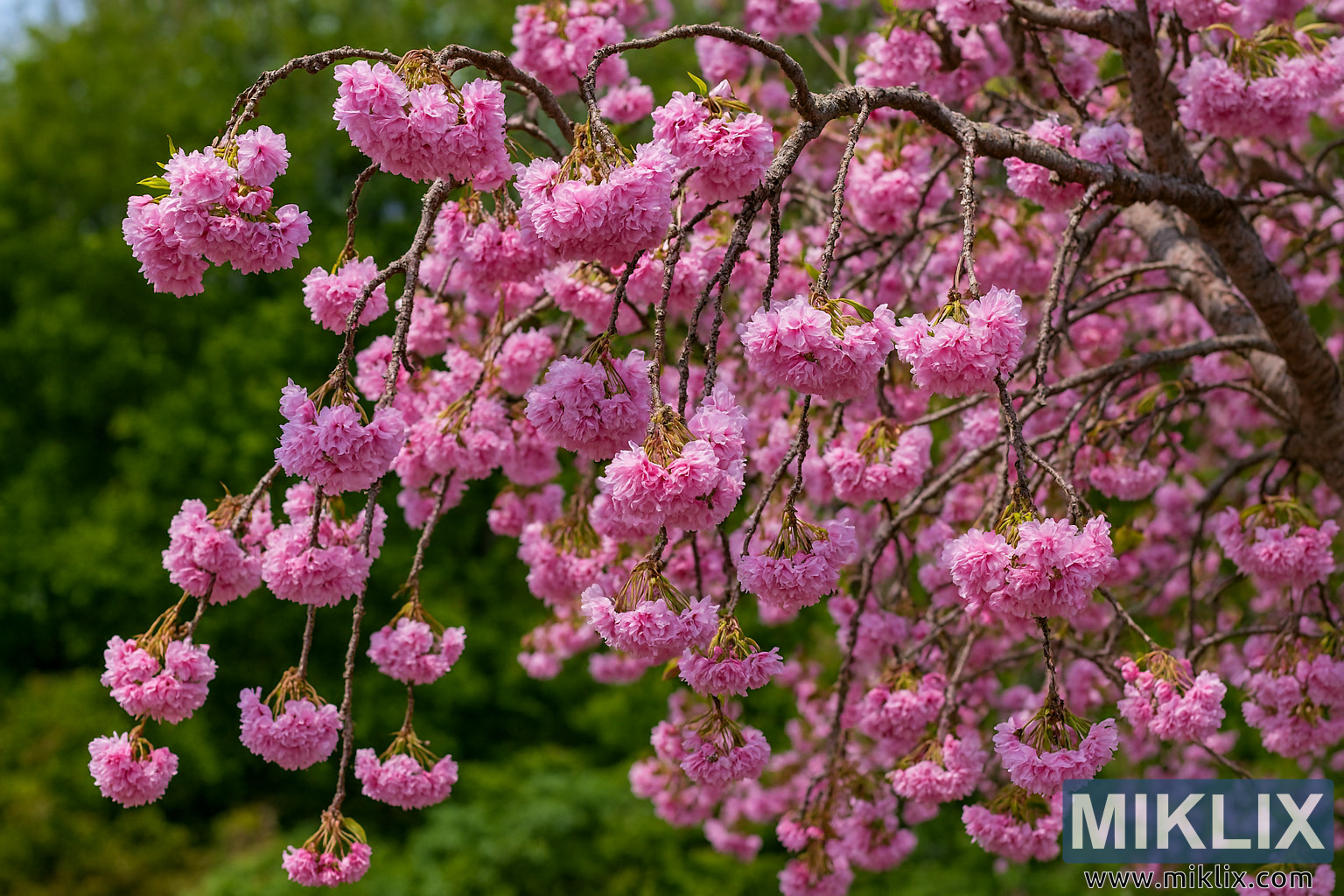 വസന്തകാലത്ത് ചീലിന്റെ വീപ്പിംഗ് ചെറിയുടെ മനോഹരമായ സൗന്ദര്യം കണ്ടെത്തൂ, ശാന്തമായ പൂന്തോട്ട പശ്ചാത്തലത്തിൽ കാസ്കേഡിംഗ് ശാഖകളും ഇടതൂർന്ന പിങ്ക് ഇരട്ട പൂക്കളും ഇതിൽ ഉൾപ്പെടുന്നു.