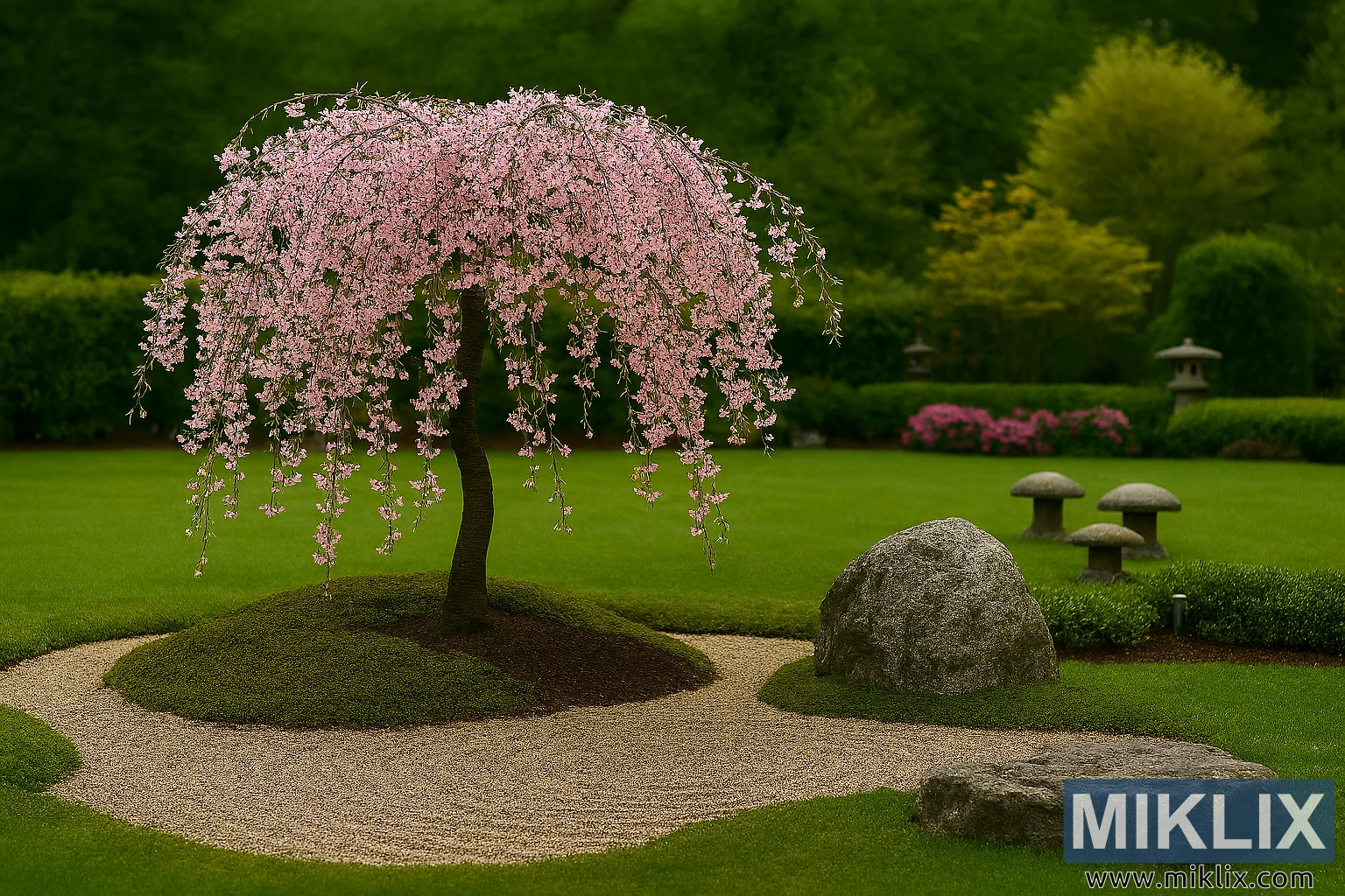 ഈ ഉയർന്ന റെസല്യൂഷനുള്ള ലാൻഡ്സ്കേപ്പ് ചിത്രം വസന്തകാലത്ത് ശാന്തമായ ഒരു ജാപ്പനീസ്-പ്രചോദിത പൂന്തോട്ടം പകർത്തുന്നു, കരയുന്ന ചെറി മരം (പ്രൂണസ് സുഹിർട്ടെല്ല 'പെൻഡുല') അതിന്റെ കേന്ദ്രബിന്ദുവാണ്. മരം മനോഹരമായി ഒരു ചെറിയ, ഉയർന്ന കുന്നിൻ മുകളിൽ നിൽക്കുന്നു, അതിന്റെ നേർത്ത തുമ്പിക്കൈ പായലും ചരലും നിറഞ്ഞ ഒരു കിടക്കയിൽ നിന്ന് ഉയർന്നുവരുന്നു. ഈ തുമ്പിക്കൈയിൽ നിന്ന്, കമാനാകൃതിയിലുള്ള ശാഖകൾ മനോഹരമായ സ്വീപ്പുകളായി താഴേക്ക് പതിക്കുന്നു, മൃദുവായ പിങ്ക് പൂക്കളാൽ സാന്ദ്രമായി അലങ്കരിച്ചിരിക്കുന്നു. ഓരോ പൂവിലും അഞ്ച് അതിലോലമായ ദളങ്ങൾ അടങ്ങിയിരിക്കുന്നു, ഇളം ചുവപ്പ് മുതൽ മധ്യഭാഗത്ത് ആഴത്തിലുള്ള റോസ് വരെയുള്ള സൂക്ഷ്മമായ വർണ്ണ ഗ്രേഡേഷനുകൾ ഉണ്ട്. പൂക്കൾ ഒരു മൂടുശീല പോലുള്ള മേലാപ്പ് ഉണ്ടാക്കുന്നു, അത് നിലത്ത് തൊടുന്നതുപോലെ, ചലനത്തെയും ശാന്തതയെയും ഉണർത്തുന്നു.