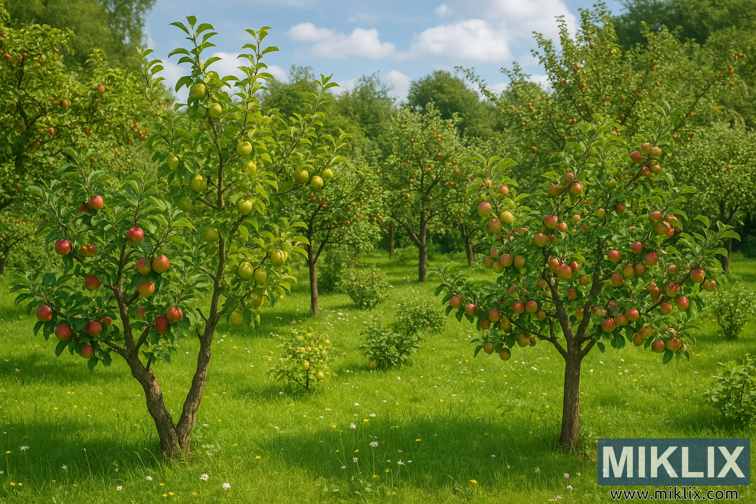 ചുവപ്പും മഞ്ഞയും പല നിറങ്ങളിലുള്ള പഴങ്ങൾ കായ്ക്കുന്ന ആപ്പിൾ മരങ്ങൾ, പച്ചപ്പുല്ല്, കാട്ടുപൂക്കൾ, മൃദുവായ വേനൽക്കാല വെളിച്ചം എന്നിവയാൽ ചുറ്റപ്പെട്ട ശാന്തമായ ഒരു തോട്ട ദൃശ്യം.
