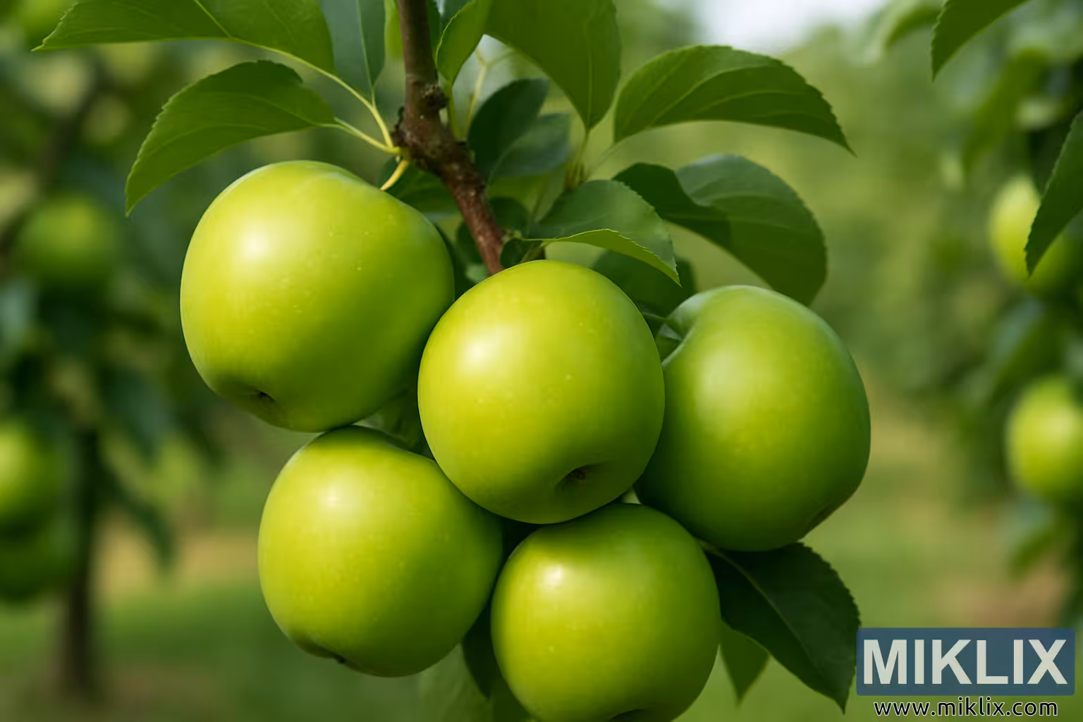 ഗ്രാനി സ്മിത്ത് ആപ്പിളിന്റെ ഒരു ക്ലോസപ്പ്, മൃദുവായി മങ്ങിയ തോട്ടത്തിന്റെ പശ്ചാത്തലത്തിൽ, ചുറ്റും ഇലകളുള്ള ഒരു ശാഖയിൽ കൂട്ടമായി നിൽക്കുന്ന തിളങ്ങുന്ന പച്ച തിളങ്ങുന്ന പഴങ്ങൾ കാണിക്കുന്നു.