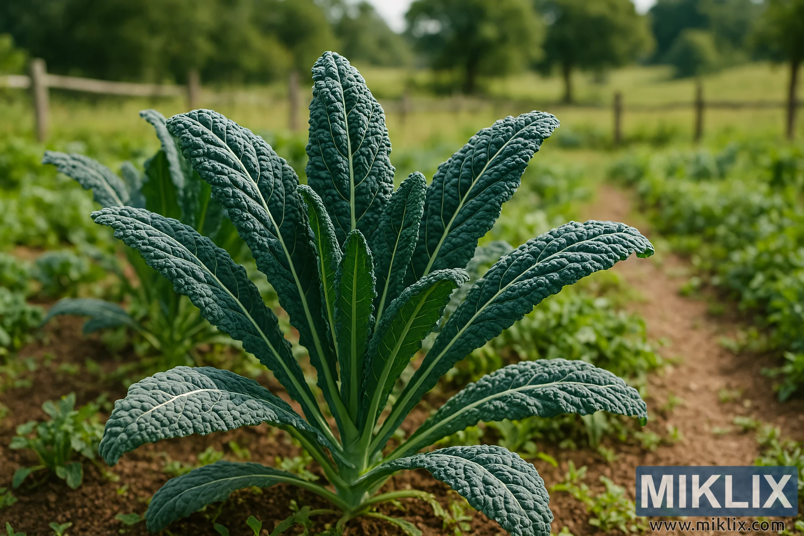 ചുറ്റുപാടുമുള്ള പരിസ്ഥിതി നന്നായി പരിപാലിക്കപ്പെടുന്ന ഒരു ഗ്രാമപ്രദേശത്തിന്റെ ശാന്തതയും ഫലഭൂയിഷ്ഠതയും പ്രതിഫലിപ്പിക്കുന്നു. കാലെ വൃത്തിയുള്ളതും മൺനിരകളിലുമായി വളരുന്നു, പുതുതായി ഉഴുതുമറിച്ചതും ഈർപ്പമുള്ളതുമായ ചുവപ്പ് കലർന്ന തവിട്ടുനിറത്തിലുള്ള മണ്ണിൽ, താഴ്ന്ന വളരുന്ന കളകളും ഇളം ചെടികളും നിറഞ്ഞിരിക്കുന്നു. കാലെയ്ക്ക് പിന്നിൽ, കൂടുതൽ ഇലക്കറികളുടെ നിരകൾ പശ്ചാത്തലത്തിലേക്ക് മൃദുവായി വ്യാപിക്കുന്നു, പ്രാഥമിക വിഷയത്തെ എടുത്തുകാണിക്കാൻ വയലിന്റെ ആഴത്താൽ ചെറുതായി മങ്ങുന്നു. അകലെ, കാലാവസ്ഥ ബാധിച്ച പോസ്റ്റുകളും റെയിലുകളും കൊണ്ട് നിർമ്മിച്ച ഒരു ഗ്രാമീണ മരവേലി പൂന്തോട്ടത്തിന്റെ അതിർത്തിയെ അടയാളപ്പെടുത്തുന്നു, അതിന്റെ അസമമായ ഘടന കാലെ ഇലകളുടെ ജൈവ സമമിതിയുമായി മനോഹരമായി വ്യത്യാസപ്പെട്ടിരിക്കുന്നു. വേലിക്കപ്പുറം, ഒരു ഇടയ ഭൂപ്രകൃതി വികസിക്കുന്നു: പച്ചപ്പിന്റെ വ്യത്യസ്ത ഷേഡുകളിൽ മരങ്ങൾ നിറഞ്ഞ ഉരുണ്ട പുൽമേടുകൾ, അവയുടെ മേലാപ്പുകൾ മൃദുവായി ഉച്ചതിരിഞ്ഞ് വെളിച്ചത്തിൽ വ്യാപിച്ചിരിക്കുന്നു.