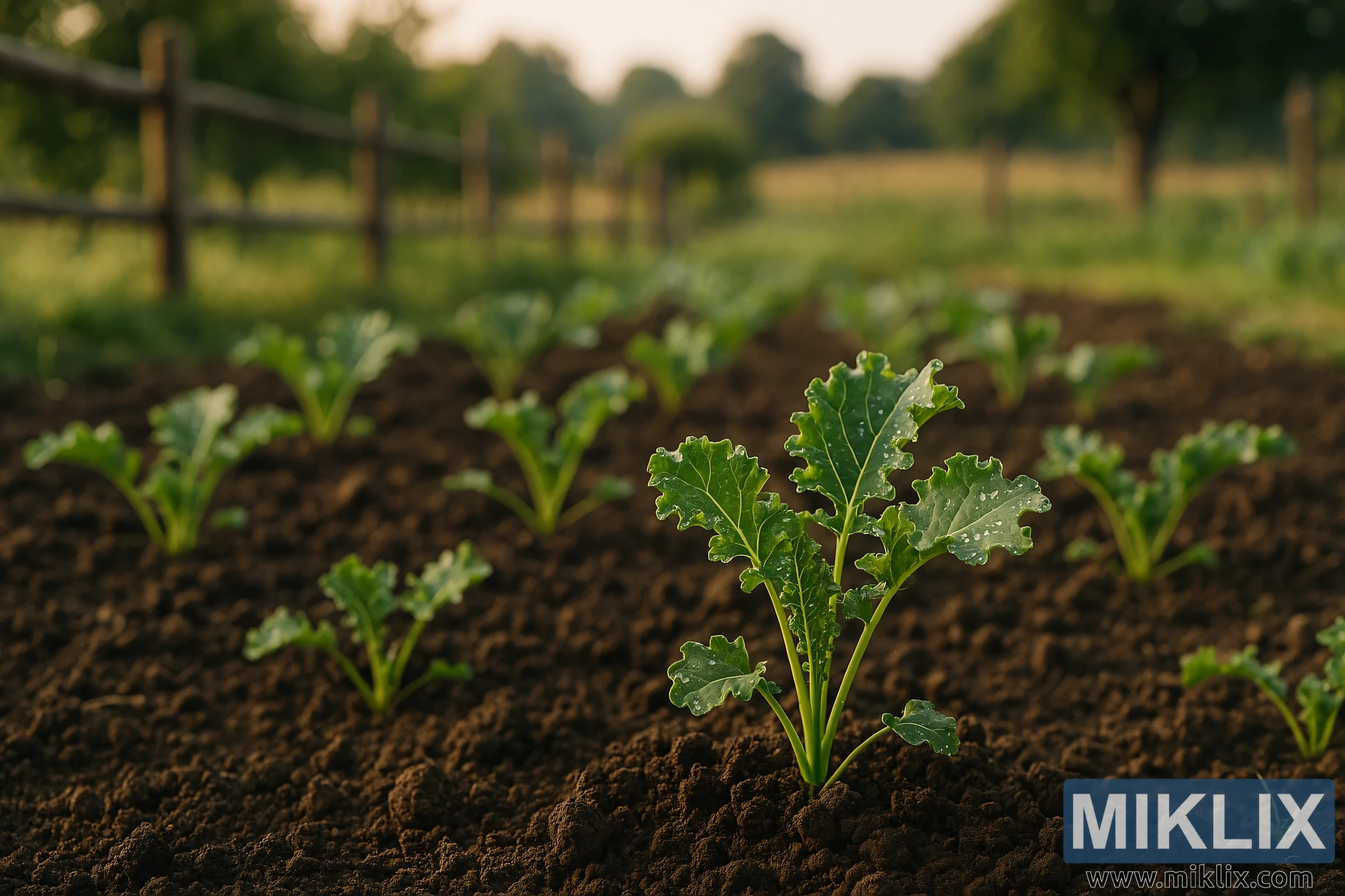 പുലർച്ചെ വെളിച്ചത്തിൽ പ്രശാന്തമായ ഒരു ഗ്രാമീണ ഉദ്യാനത്തിൽ, മഞ്ഞുതുള്ളികൾ നിറഞ്ഞ ഇളം കാലെ ചെടികളുടെ നിരകൾ കാണാം, അവ ഒരു ഗ്രാമീണ മരവേലിക്കും അതിനപ്പുറത്തുള്ള തുറന്ന പച്ചപ്പാടങ്ങൾക്കും അരികിൽ സമ്പന്നമായ തവിട്ടുനിറത്തിലുള്ള മണ്ണിൽ വളരുന്നു.