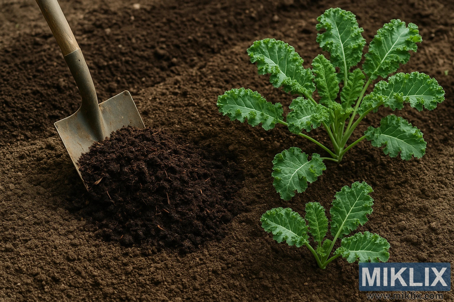 പച്ചക്കറി വളർച്ചയ്ക്കായി, പ്രത്യേകിച്ച് കാലെയ്ക്കായി, പുതുതായി തയ്യാറാക്കിയ ഒരു പൂന്തോട്ട കിടക്കയെ സമ്പുഷ്ടമാക്കുന്നതിന്റെ വളരെ വിശദമായതും യാഥാർത്ഥ്യബോധമുള്ളതുമായ ഒരു ദൃശ്യം ഈ ചിത്രം അവതരിപ്പിക്കുന്നു. ലാൻഡ്സ്കേപ്പ്-ഓറിയന്റഡ് കോമ്പോസിഷൻ മണ്ണിന്റെ സ്പർശന സമ്പന്നതയെയും ഇളം കാലെ സസ്യങ്ങളുടെ പച്ചപ്പിനെയും എടുത്തുകാണിക്കുന്നു. ഫ്രെയിമിന്റെ ഇടതുവശത്ത്, കാലാവസ്ഥ ബാധിച്ച മരക്കൊമ്പുള്ള ഒരു ഉറപ്പുള്ള ലോഹ കോരിക ഇരുണ്ടതും ഈർപ്പമുള്ളതുമായ കമ്പോസ്റ്റിന്റെ ഒരു കുന്നിൽ ഭാഗികമായി ഉൾച്ചേർത്തിരിക്കുന്നു. കമ്പോസ്റ്റിന്റെ പൊടിഞ്ഞ ഘടന നന്നായി പകർത്തിയിരിക്കുന്നു - അതിന്റെ ജൈവവസ്തുക്കൾ ദൃശ്യപരമായി അഴുകിയ സസ്യ നാരുകളും ഹ്യൂമസും കൊണ്ട് നിറഞ്ഞിരിക്കുന്നു, അതിനടിയിലുള്ള അല്പം ഭാരം കുറഞ്ഞതും അയഞ്ഞതുമായ മണ്ണിൽ നിന്ന് വ്യത്യസ്തമാണ്. ചിത്രത്തിന്റെ വലത് പകുതിയിൽ നിരവധി കാലെ സസ്യങ്ങൾ, അവയുടെ പരുക്കൻ, ഊർജ്ജസ്വലമായ പച്ച ഇലകൾ ഒരു റേഡിയൽ പാറ്റേണിൽ പുറത്തേക്ക് നീണ്ടുനിൽക്കുന്നു. ഓരോ ഇലയും ചടുലവും ജീവൻ നിറഞ്ഞതുമാണ്, സങ്കീർണ്ണമായ സിര ഘടനകളും ദന്തങ്ങളോടുകൂടിയ അരികുകളും പ്രദർശിപ്പിക്കുന്നു, അത് പൂന്തോട്ടത്തിലുടനീളം മൃദുവും വ്യാപിക്കുന്നതുമായ പ്രകാശ ഫിൽട്ടറിംഗ് പിടിക്കുന്നു. സസ്യങ്ങൾ വരികളായി തുല്യമായി അകലത്തിൽ, ഫലഭൂയിഷ്ഠവും വായുസഞ്ചാരമുള്ളതും ചെറുതായി ഈർപ്പമുള്ളതുമായി കാണപ്പെടുന്ന പുതുതായി കൃഷി ചെയ്ത മണ്ണിൽ നിന്ന് ഉയർന്നുവരുന്നു, പച്ചക്കറി കൃഷിക്ക് അനുയോജ്യമാണ്.