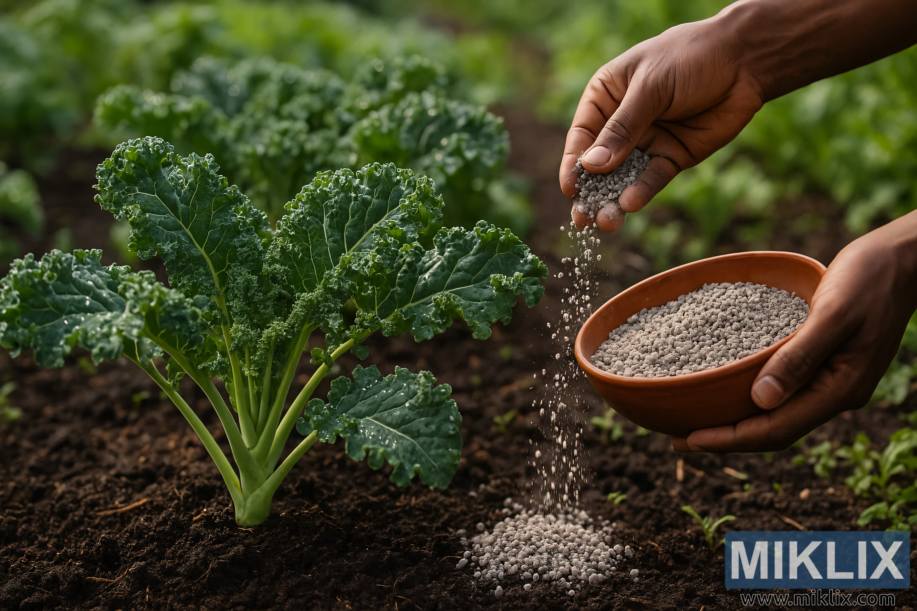 Applying Organic Fertilizer to Kale Plants in a Lush Garden