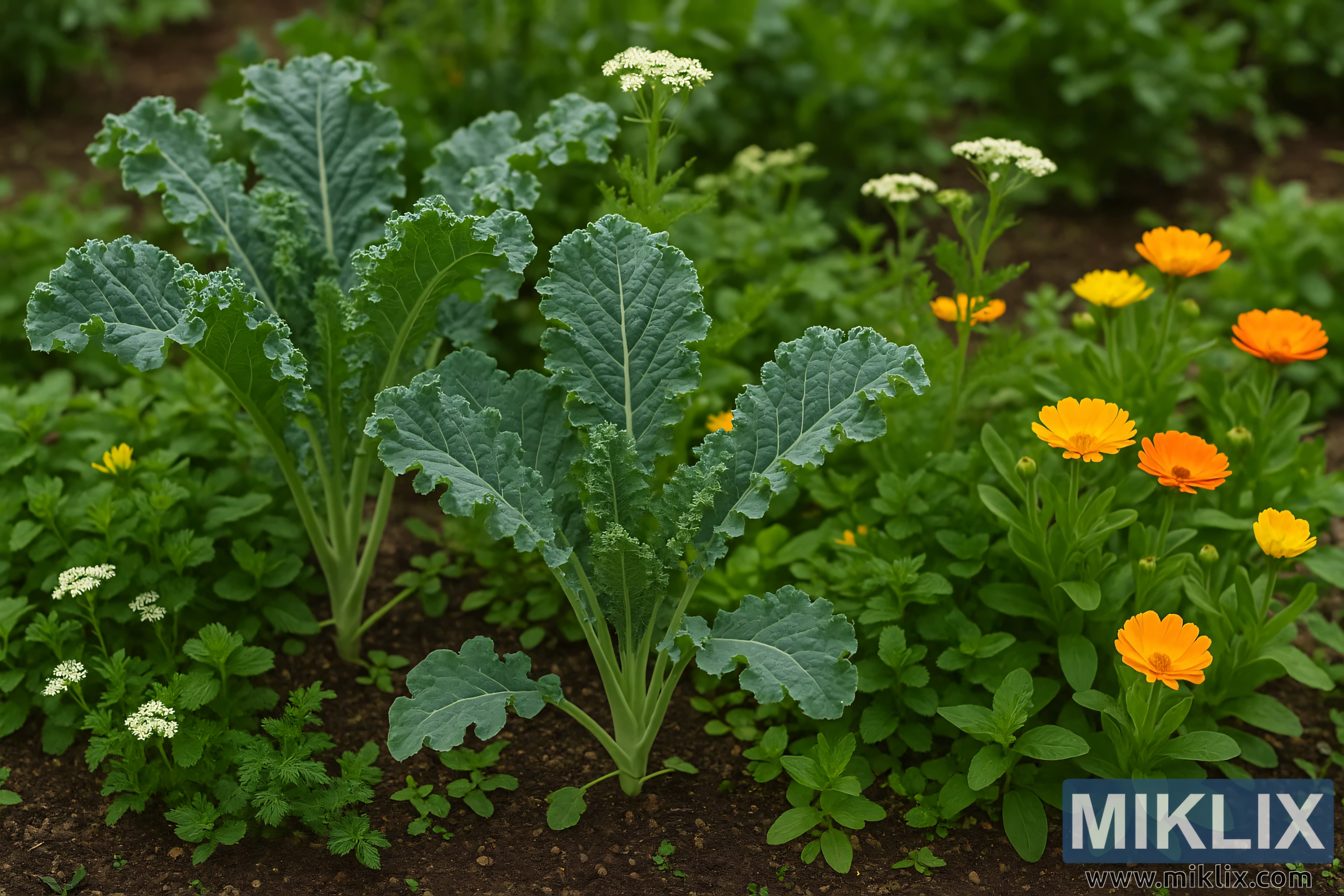 കലണ്ടുല, യാരോ തുടങ്ങിയ പ്രയോജനകരമായ സഹ സസ്യങ്ങളുടെ കൂടെ വളരുന്ന കാലെയെ അവതരിപ്പിക്കുന്ന ഒരു ഉജ്ജ്വലമായ പൂന്തോട്ട ദൃശ്യം, പ്രകൃതിദത്ത സഹനടീലിന്റെ സമൃദ്ധമായ ഉദാഹരണം തെളിയിക്കുന്നു.
