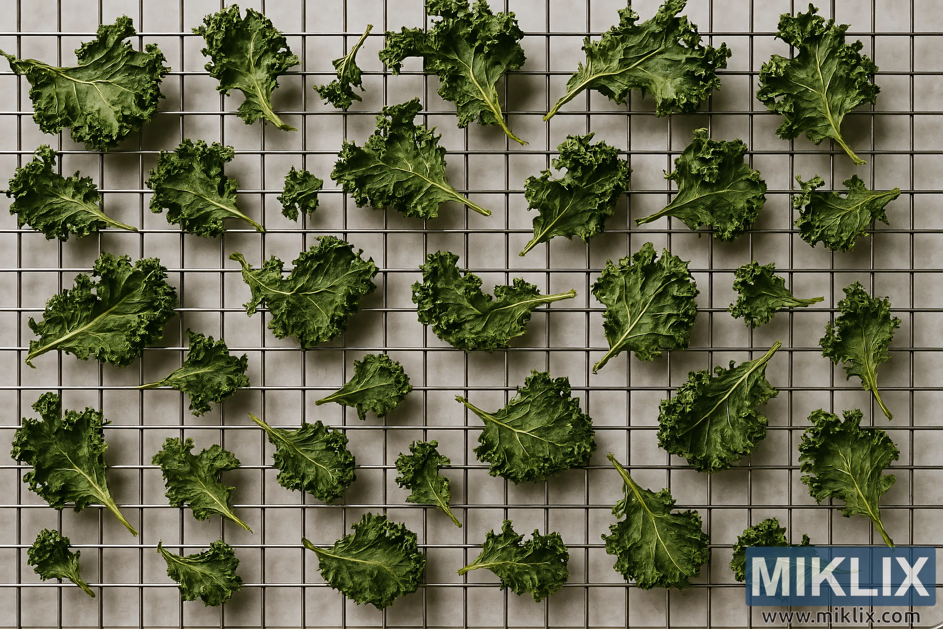 ഒരു ലോഹ ഉണക്കൽ അല്ലെങ്കിൽ തണുപ്പിക്കൽ റാക്കിൽ തുല്യമായി വിതറിയ ഉണങ്ങിയ കാലെ ഇലകളുടെ സൂക്ഷ്മമായി ക്രമീകരിച്ച ഒരു ശേഖരം ചിത്രം അവതരിപ്പിക്കുന്നു. മുകളിൽ നിന്ന് താഴേക്ക് വീക്ഷണകോണിൽ നിന്ന് പകർത്തിയ ഈ രചന, ഇലകളുടെ ഘടന, സമമിതി, ജൈവ സൗന്ദര്യം എന്നിവയ്ക്ക് പ്രാധാന്യം നൽകുന്നു. ഓരോ കാലെ കഷണവും അതുല്യമായ സവിശേഷതകൾ പ്രകടിപ്പിക്കുന്നു - ചില ഇലകൾ ദൃഡമായി ചുരുണ്ടതും ഒതുക്കമുള്ളതുമാണ്, മറ്റുള്ളവ വീതിയേറിയതും പരന്നതുമാണ്, സങ്കീർണ്ണമായ സിര പാറ്റേണുകൾ അവയുടെ പ്രതലങ്ങളിൽ ദൃശ്യമാണ്. ചിത്രത്തിലുടനീളം നിറം സൂക്ഷ്മമായി വ്യത്യാസപ്പെടുന്നു, ആഴത്തിലുള്ള, കടും പച്ചനിറം മുതൽ നിർജ്ജലീകരണ പ്രക്രിയയെ സൂചിപ്പിക്കുന്ന ഇളം, ചെറുതായി മഞ്ഞ നിറങ്ങൾ വരെ.