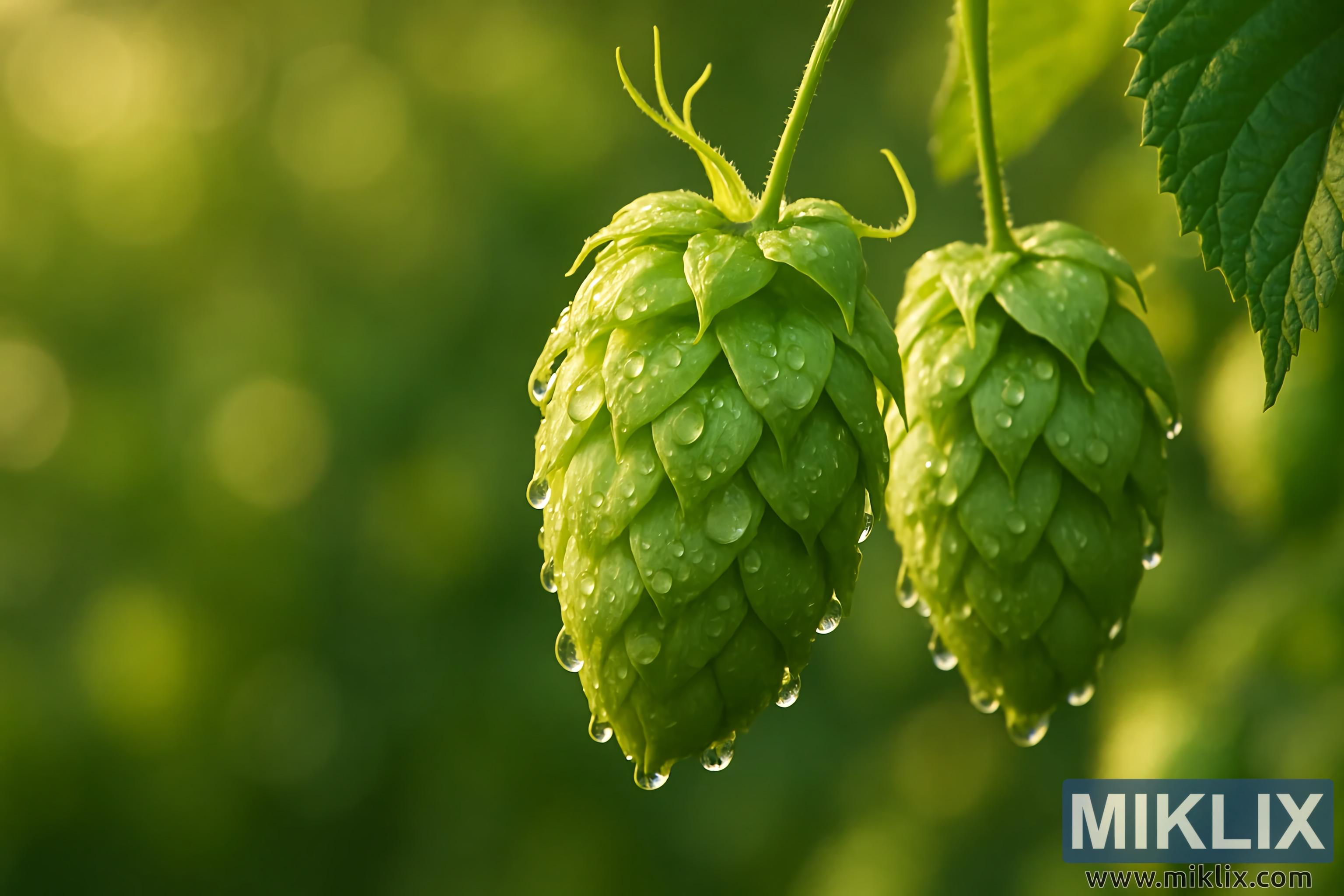 Гэрэл, чийг, хэлбэр дүрс нь нийлж, эрч хүч, амлалт өгөх дүр зургийг бий болгодог хоп ургамлын амьдралын мөчлөгийн хоромхон зуурын, бараг гэгээн мөчийг гэрэл зурагт буулгажээ. Хоёр махлаг Southern Brewer хоп боргоцой нь өглөөний нарны туяанд алтан тэврэлтэнд өлгөөтэй, ишнээсээ зөөлөн унждаг. Боргоцой бүр шүүдэр дуслуудаар гялалзаж, ус нь цаасан шигтгээтэй үнэт чулуу шиг наалдаж, гэрлийг жижиг гялалзсан цэг болгон хугална. Эдгээр дуслууд нь боргоцойны контурыг зурж, тэдгээрийн давхаргат бүтэц, байгалийн геометрийг тодотгож, өдрийн дулаан ирэхээс өмнө сэрүүн үүр цайхыг илтгэнэ. Гадаргуугийн гялбаа нь зөвхөн харааны баялгийг нэмэгдүүлээд зогсохгүй ургамлын уян хатан чанар, түүний өсөлтийг бүрдүүлдэг элементүүдтэй ойр дотно харилцааг сануулдаг.
