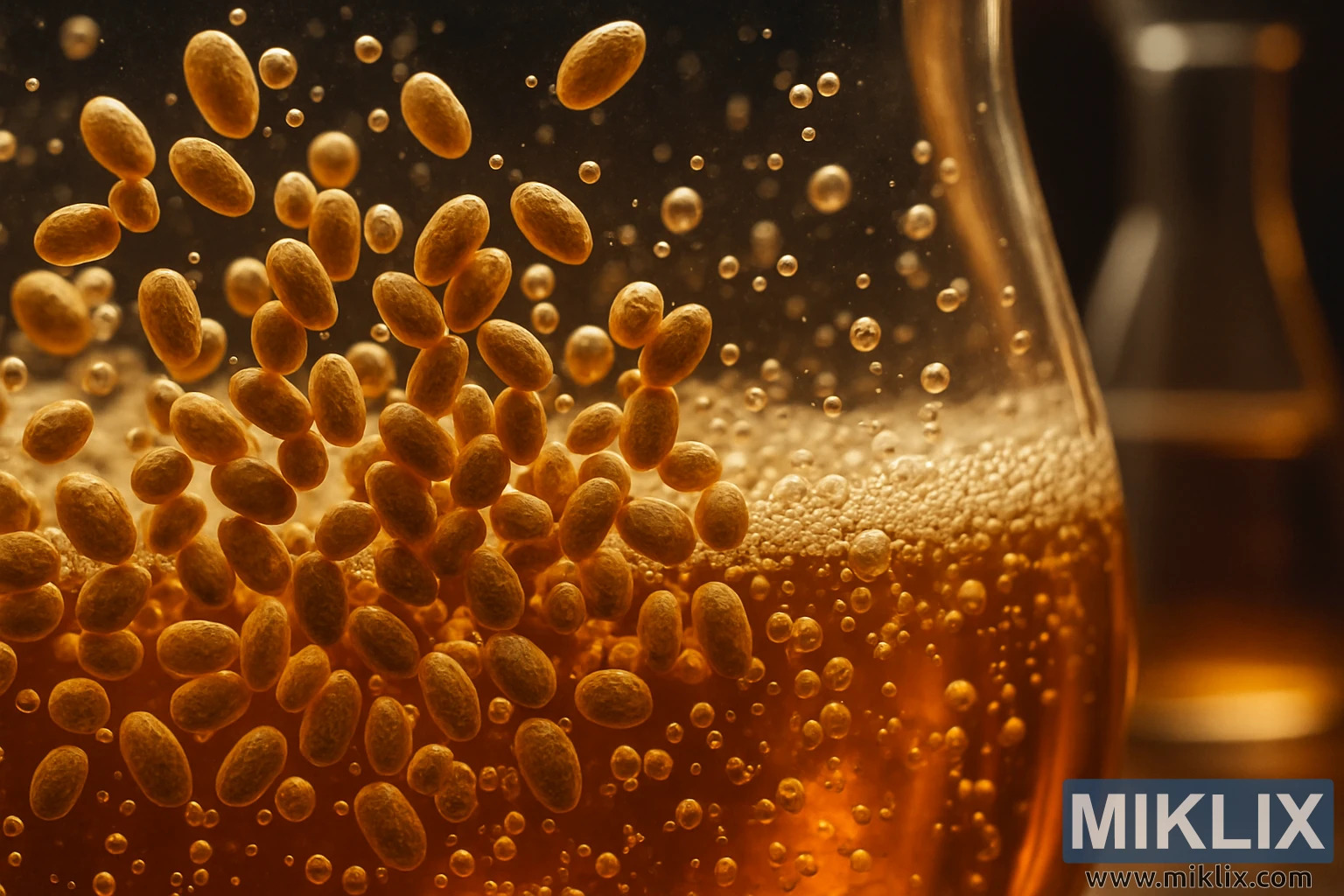 Өсөн нэмэгдэж буй бөмбөлөгүүдтэй шар шингэнд түдгэлзүүлсэн шар айраг исгэх мөөгөнцрийн нарийн зураг, исгэх ур чадвар, нарийвчлалыг онцолсон.