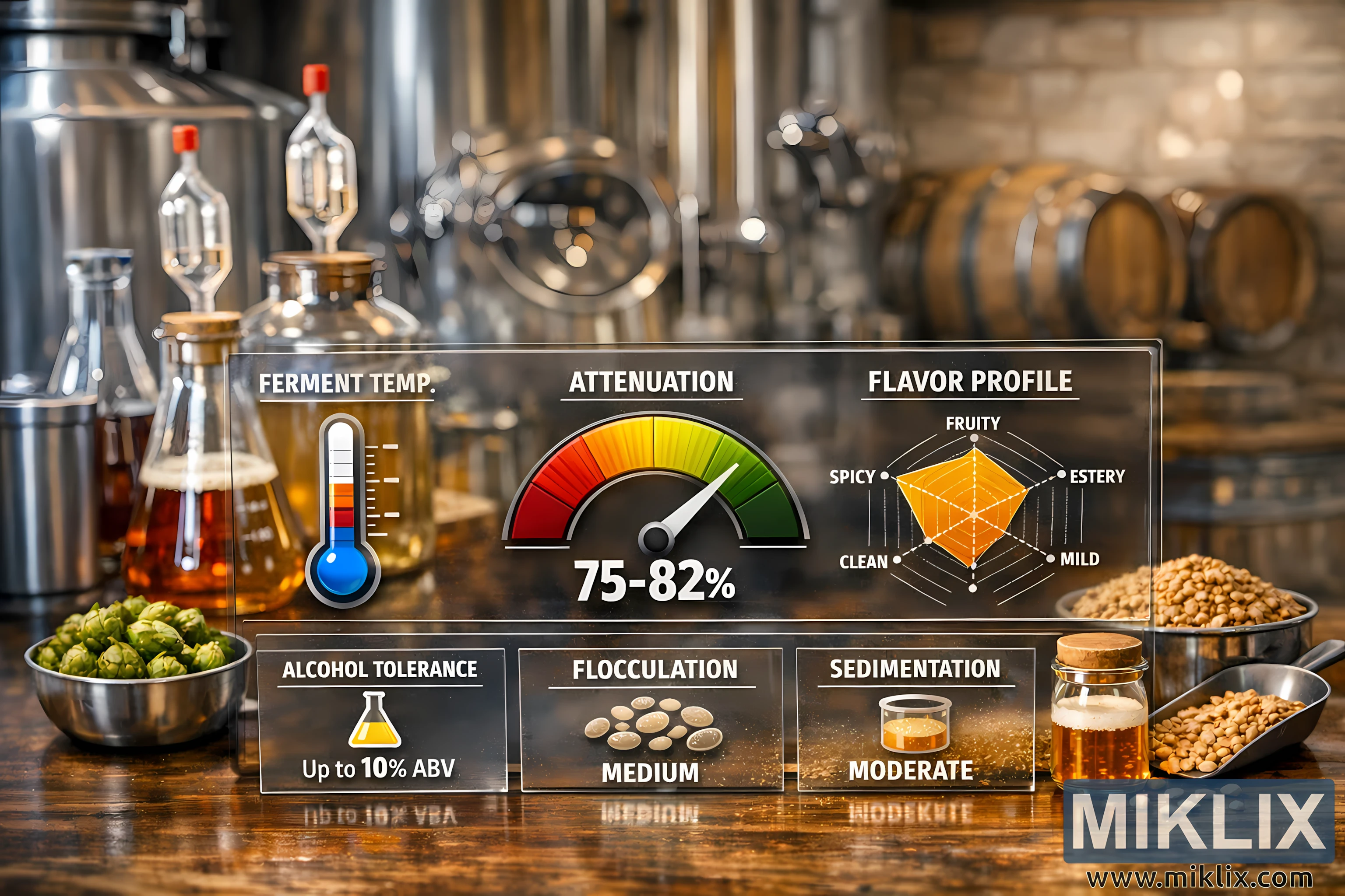 Зураг дээр исгэх мөөгөнцрийн омгийн үзүүлэлтүүдийг мэдээлэл сайтай, харааны хувьд сонирхолтой байдлаар дамжуулах зорилготой маш нарийвчилсан, мэргэжлийн харааны найрлагыг харуулав. Урд талд нь тунгалаг, шилэн хэлбэртэй самбар нь мөөгөнцрийн чухал статистик мэдээллийг тод боловч хяналттай өнгөөр бүрдүүлсэн цэвэр, орчин үеийн инфографикаар харуулдаг. Тунгалаг шошго, дүрсүүд нь исгэх температур, сулруулах хүрээ, спиртийн тэсвэрлэлт, флокуляци, тунадасны зан төлөв, амтны профайл зэрэг исгэх гол параметрүүдийг тодруулдаг. Сулруулах хэмжүүрийг төвд байрлуулсан бөгөөд дулаан улаанаас шинэхэн ногоон хүртэл өнгөөр ялгасан циферблат хэлбэрээр харуулсан бөгөөд үзэгчийн анхаарлыг шууд татдаг. Ойролцоох нь хэв маягийн термометрийн график нь исгэх температурыг харуулдаг бол доорх жижиг самбарууд нь спиртийн тэсвэрлэлт, флокуляци, тунадасыг энгийн, ойлгомжтой тэмдэгээр нэгтгэн харуулдаг. Баруун талд радарын хэв маягийн амтны профайлын хүснэгт нь жимсний, эфирийн, халуун ногоотой, зөөлөн, цэвэр зэрэг шинж чанаруудыг харааны хувьд тэнцвэржүүлж, мөөгөнцрийн мэдрэхүйн нөлөөллийн талаарх ойлголтыг өгдөг.