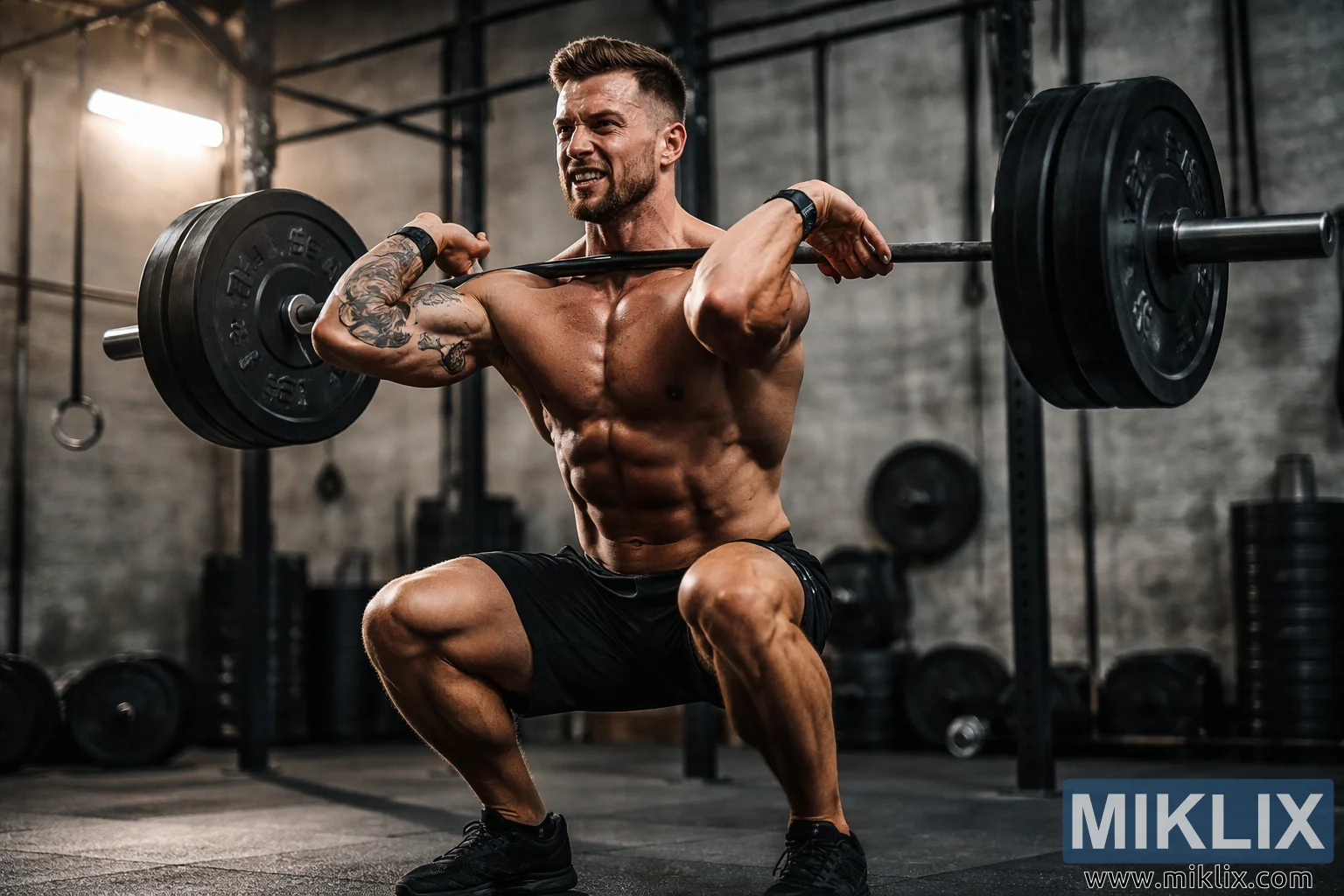 Muscular Athlete Performing a Heavy Front Squat in a CrossFit Gym