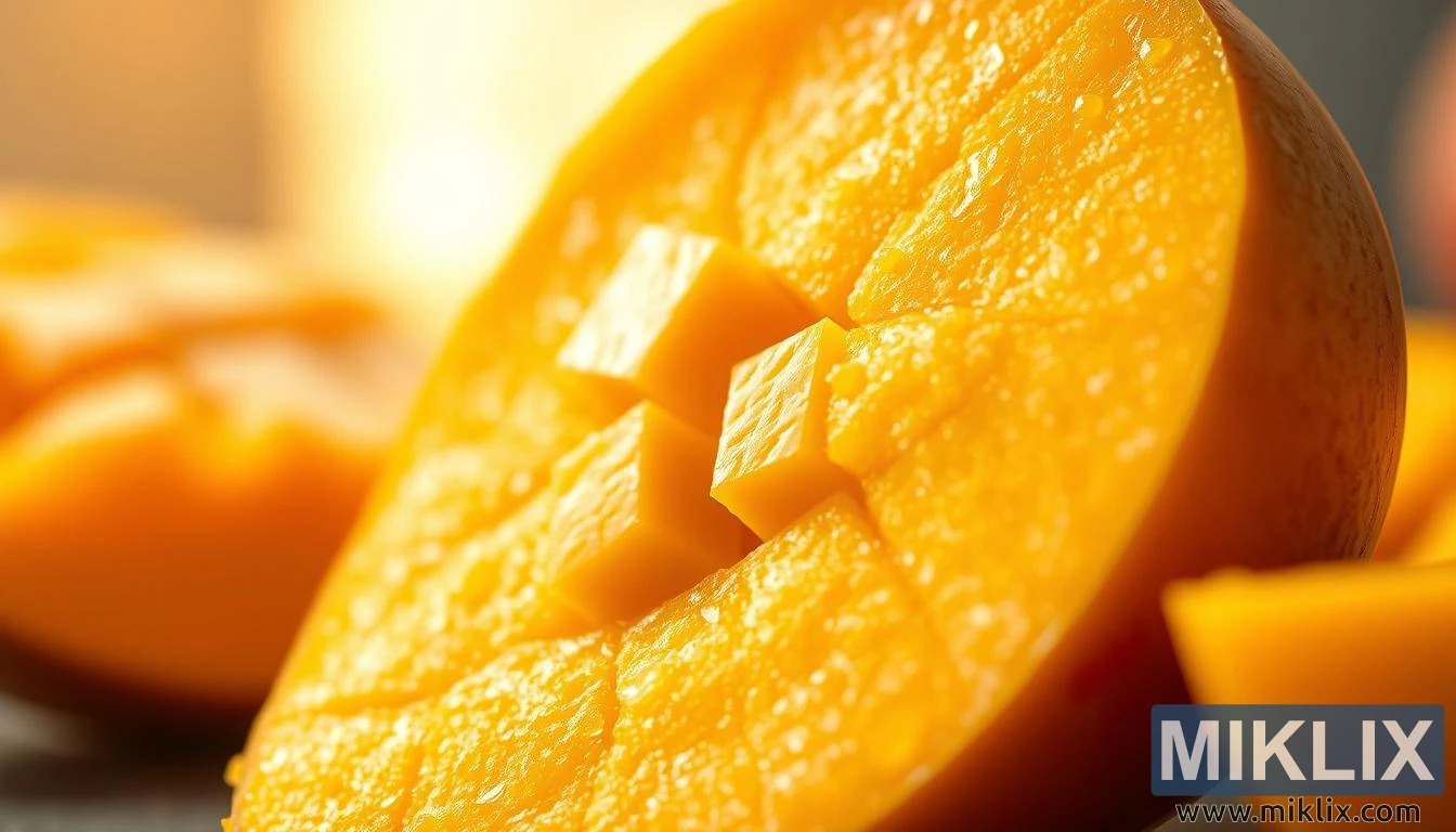 Зөөлөн дулаан гэрлийн дор шүүслэг эрч хүчтэй махыг гаргаж, антиоксидант болон эрүүл мэндэд үзүүлэх ашиг тусыг онцлон харуулсан алтан мангогийн өндөр нарийвчлалтай ойрын зураг.