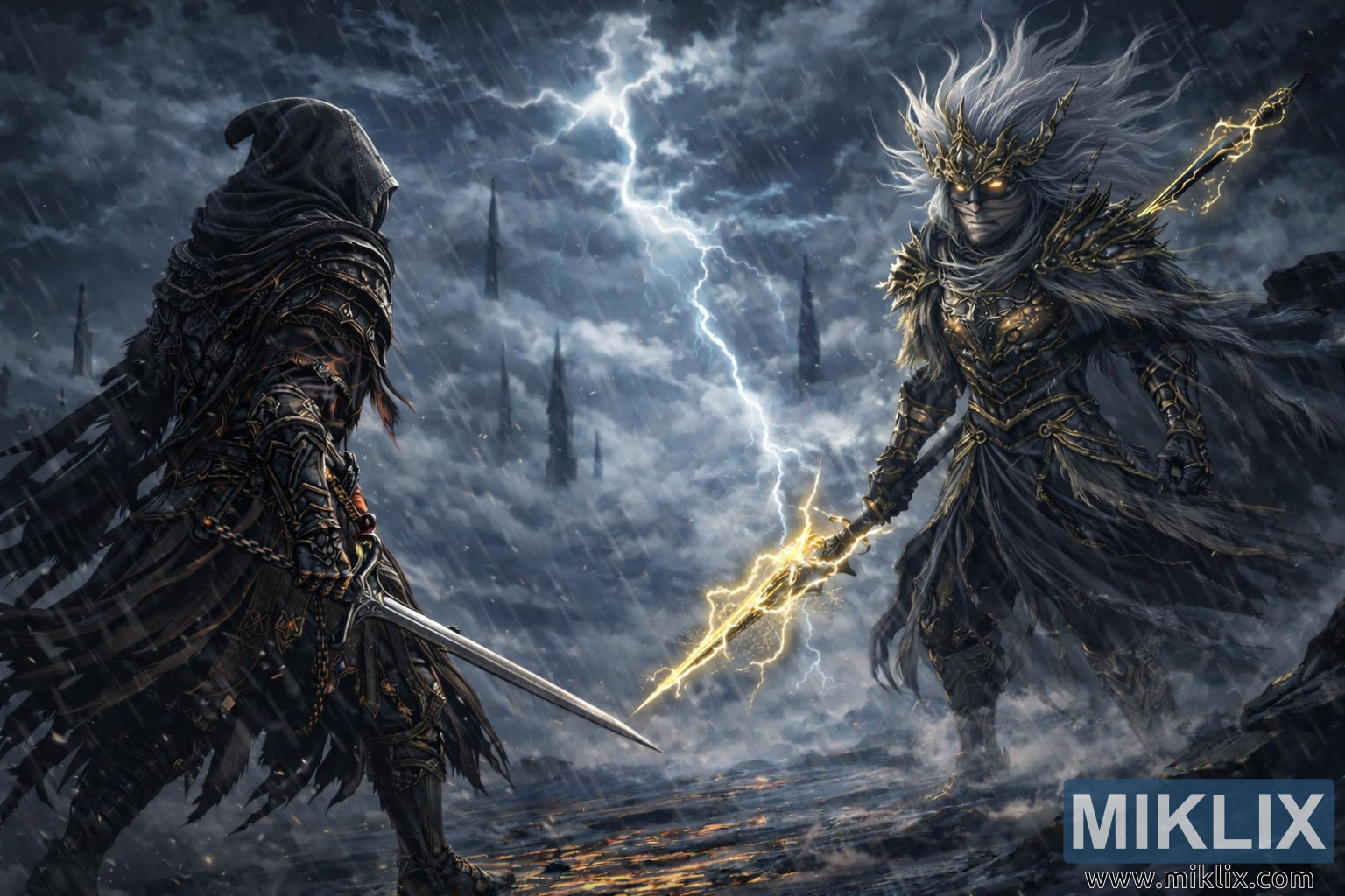 Аянга цахилгаантай шуурганы дор тулалдахаасаа өмнө үхээгүй аянга цахилгаантай хаантай тулгарч буй Сүүдрийн хуяг дуулга өмссөн бүрээстэй үнсэн саарал нэгэнийг харуулсан өндөр нарийвчлалтай анимэ хар уран зөгнөлт зураг.