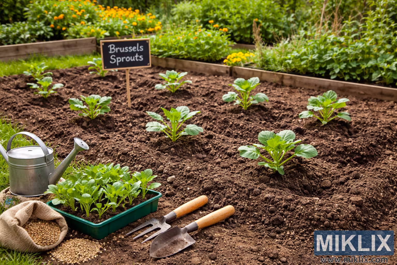 Брюссель байцаа ургуулах хамгийн тохиромжтой нөхцлийг харуулсан, үржил шимтэй хөрс, залуу Брюссель байцааны ургамал, цэцэрлэгжүүлэлтийн багаж хэрэгсэл бүхий сайн бэлтгэсэн цэцэрлэгийн өндөр чанартай зураг.