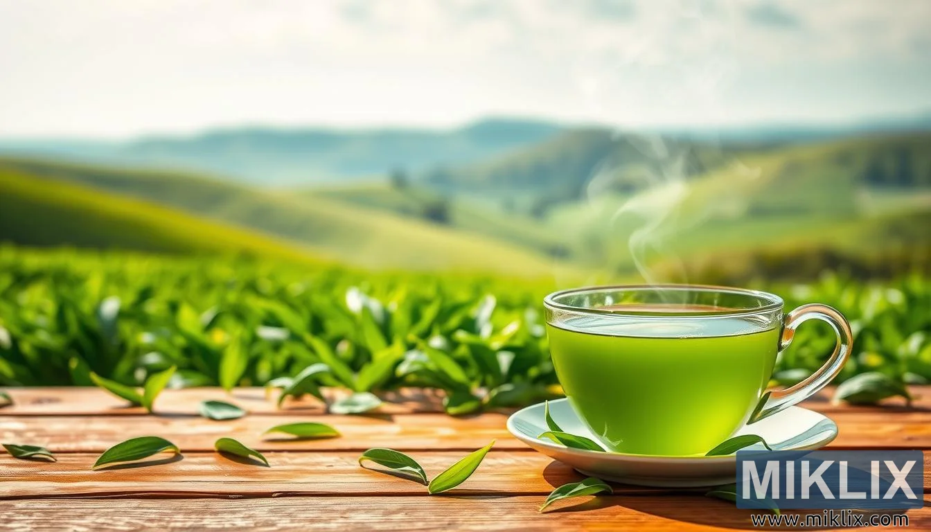 वाफाळत्या हिरव्या चहाचा कप, ताजी पाने आणि शांत लँडस्केप असलेले एक शांत दृश्य, जे विश्रांती आणि निरोगीपणा दर्शवते.