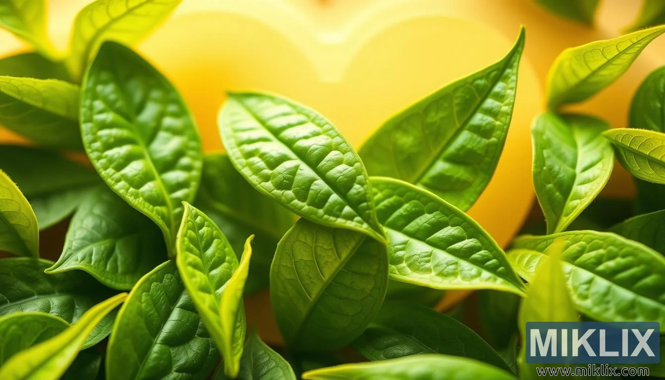 संपूर्ण रचना संतुलित आणि आकर्षक आहे, जी अग्रभागी असलेल्या पानांच्या समृद्ध पोतांपासून ते पार्श्वभूमीत चमकदार हृदयाच्या आकारापर्यंत दर्शकांच्या नजरेला नैसर्गिकरित्या मार्गदर्शन करते. थंड हिरव्या आणि उबदार पिवळ्या रंगांमधील फरक दृश्य आकर्षण वाढवतो आणि निसर्गाच्या कृपेचा आणि मानवी आरोग्यामधील प्रतीकात्मक संबंध अधोरेखित करतो. जणू काही पाने स्वतः हृदयात अन्न भरत आहेत, त्यांचे चैतन्य आणि पुनर्संचयित करणारे गुण थेट त्यात देतात. प्रतिमांचे हे सूक्ष्म परस्परसंवाद हा संदेश बळकट करते की ग्रीन टी पिणे हे केवळ हायड्रेशनचे कृत्य नाही; ते काळजीचे कृत्य आहे, दीर्घायुष्य आणि चैतन्यशीलतेमध्ये गुंतवणूक आहे.