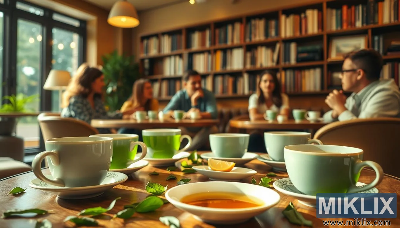 ग्रीन टी, मध आणि लिंबू असलेले उबदार कॅफे दृश्य, आराम, संभाषण आणि चहाचे सुखदायक फायदे दर्शवते.