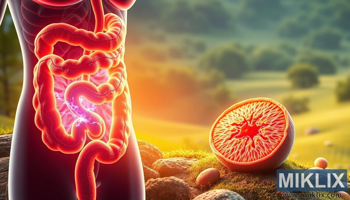 लायन्स माने मशरूमसह निरोगी आतड्याचे अति-वास्तववादी चित्रण, जे आतड्यांचे संतुलन आणि पचन निरोगीतेसाठी त्याचे पुनर्संचयित फायदे दर्शवते.