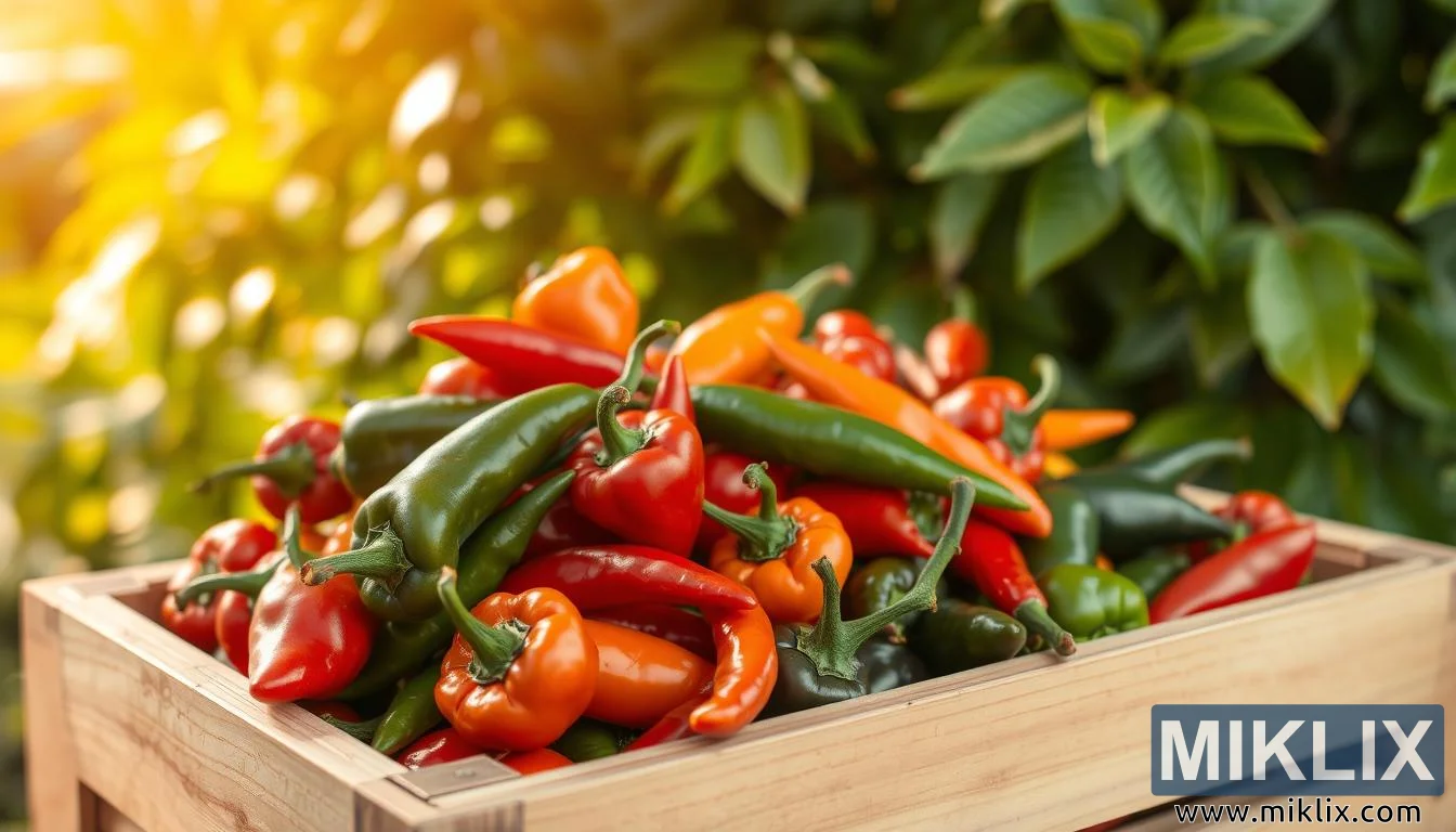 उबदार प्रकाशयोजनेसह एका ग्रामीण क्रेटमध्ये लाल, नारिंगी आणि हिरव्या रंगात चमकदार मिरच्या प्रदर्शित केल्या आहेत, जे चैतन्य आणि निसर्गाच्या विपुलतेचे प्रतीक आहेत.