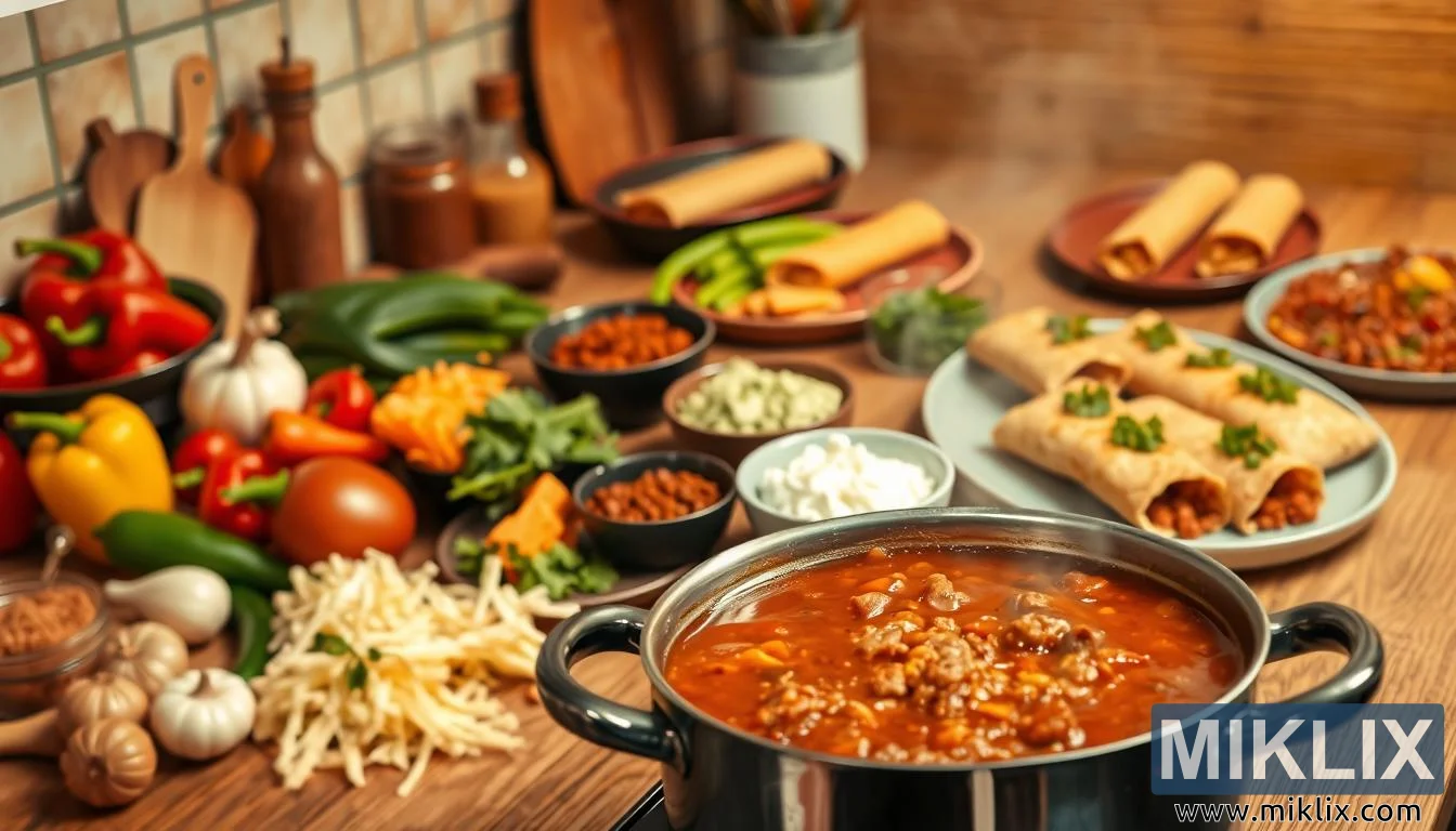 तयारीच्या जागेच्या पलीकडे, पार्श्वभूमीत पूरक पदार्थांचा एक आकर्षक प्रसार दिसून येतो, प्रत्येक पदार्थ मेजवानीसारख्या वातावरणात योगदान देतो. एका प्लेटवर गुंडाळलेले, भरलेले आणि सोनेरी रंगाचे बरिटो असतात, त्यांच्या भरण्यातून मसालेदार बीन्स, वितळलेले चीज आणि मसालेदार मांस सूचित होते. कॉर्नब्रेडची एक प्लेट जवळच आहे, त्याचा कर्कश बाह्य भाग आणि सोनेरी-पिवळा आतील भाग मिरचीच्या उष्णतेला संतुलित करण्यासाठी ग्रामीण गोडवाचा स्पर्श जोडतो. मिरचीवर आधारित अतिरिक्त पदार्थ, कदाचित कॅसरोल किंवा भरलेले मिरची, या नम्र पण शक्तिशाली रेसिपीच्या बहुमुखी प्रतिभेचे संकेत देतात. एकत्रितपणे, ते स्वयंपाकघराला परंपरेत रुजलेल्या पाककृती सर्जनशीलतेच्या उत्सवात रूपांतरित करतात.