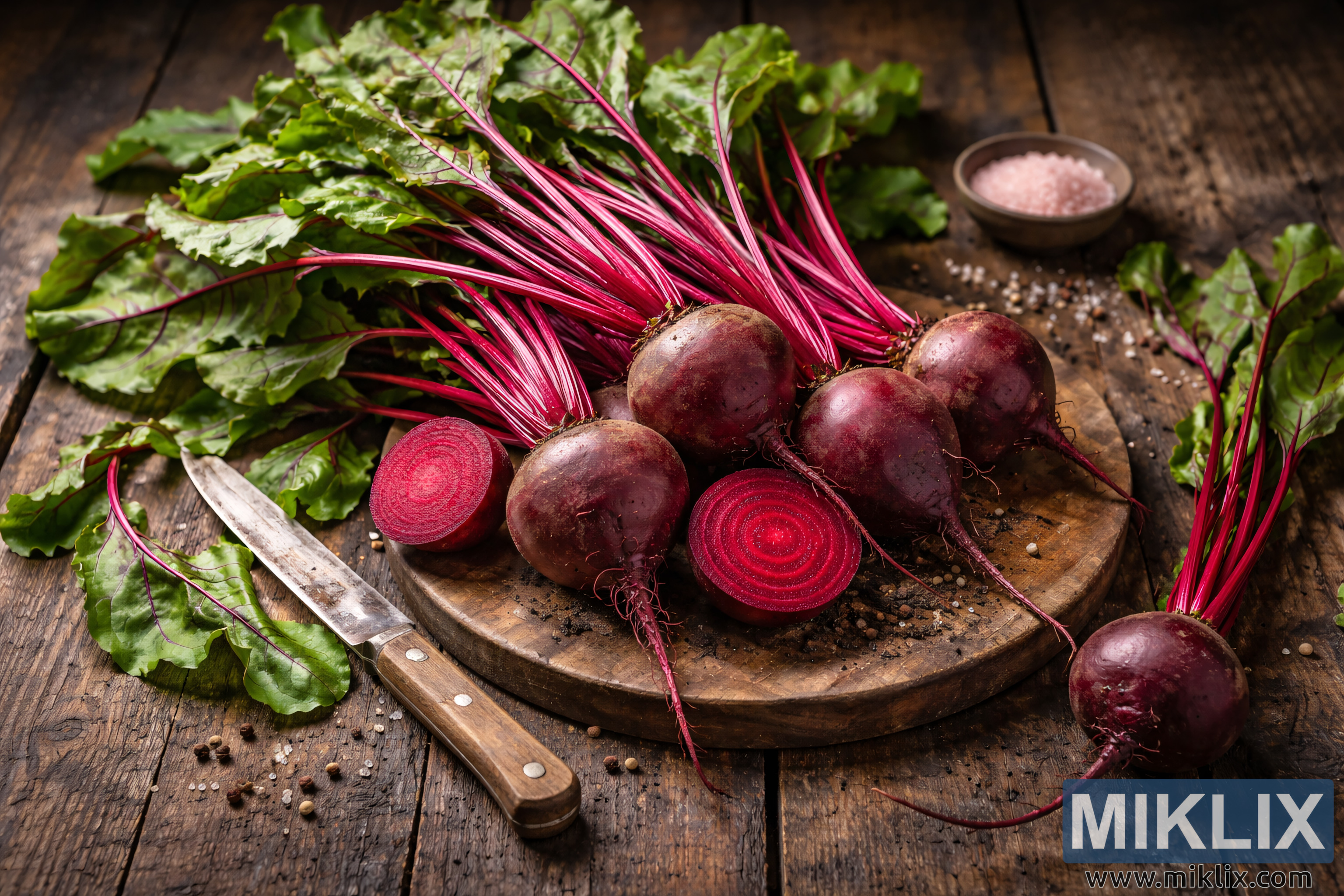 चाकू, भरड मीठ आणि नैसर्गिक प्रकाशाने सजवलेल्या, ग्रामीण लाकडी टेबलावर हिरव्या पालेभाज्यांसह चमकदार ताज्या बीट्सचा उच्च-रिझोल्यूशन स्थिर जीवनाचा फोटो.