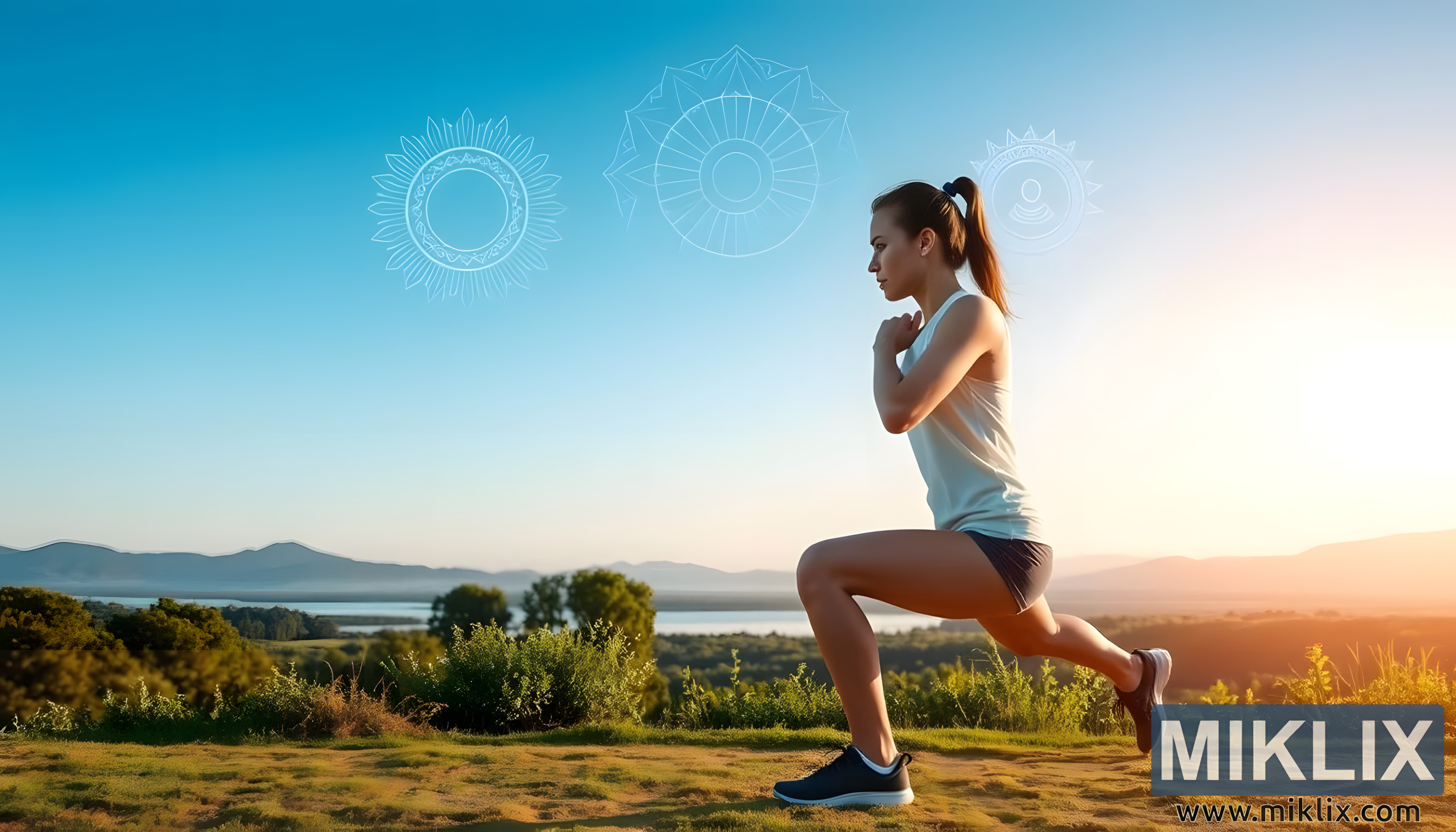 वरती, स्वच्छ आकाश दृश्याचा केवळ एक भौतिक घटक बनत नाही. सूक्ष्म, अमूर्त नमुने मंदपणे आच्छादित आहेत, मंडळे किंवा सूर्यप्रकाशासारखे पसरतात. हे आकार सजगता, ध्यान आणि मानसिक आणि भावनिक संतुलनाच्या चक्रांचे प्रतीक आहेत. त्यांची नाजूक उपस्थिती सूचित करते की शक्ती प्रशिक्षण, जेव्हा जाणीवेसह सराव केले जाते, तेव्हा ते केवळ शारीरिक स्थिती ओलांडून एक समग्र सराव बनते - शरीर, मन आणि आत्म्याचे एकीकरण. प्रत्येक भौमितिक नमुना श्वास आणि लयीची ऊर्जा प्रतिध्वनी करतो, व्यायामाच्या ध्यानाच्या गुणवत्तेला बळकटी देतो.