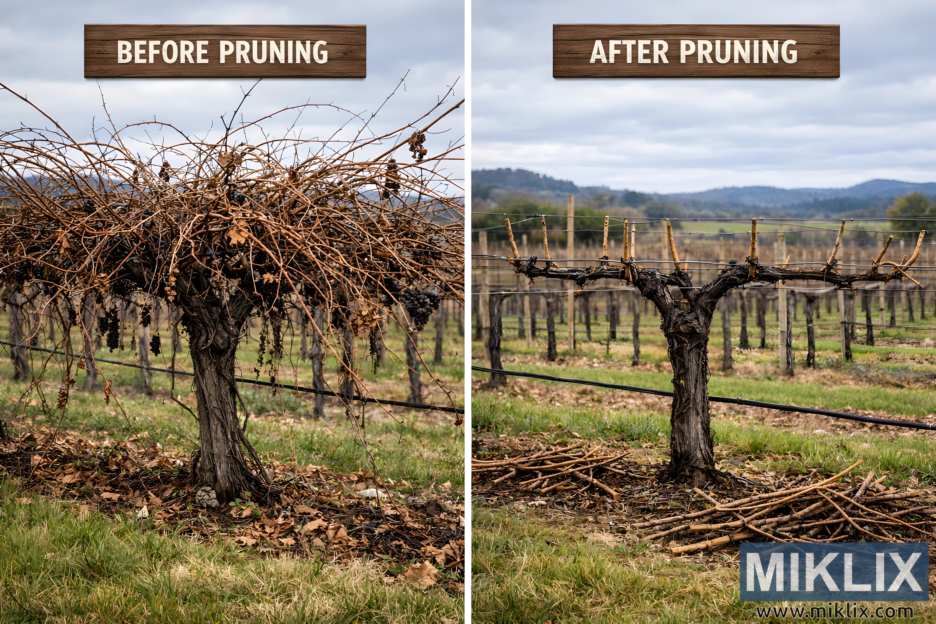 छाटणीपूर्वी आणि नंतर द्राक्षवेलीची तुलना करणारी शैक्षणिक द्राक्षबागेची प्रतिमा, योग्य द्राक्षवेलीची छाटणी तंत्रे आणि रचना स्पष्टपणे दर्शवते.