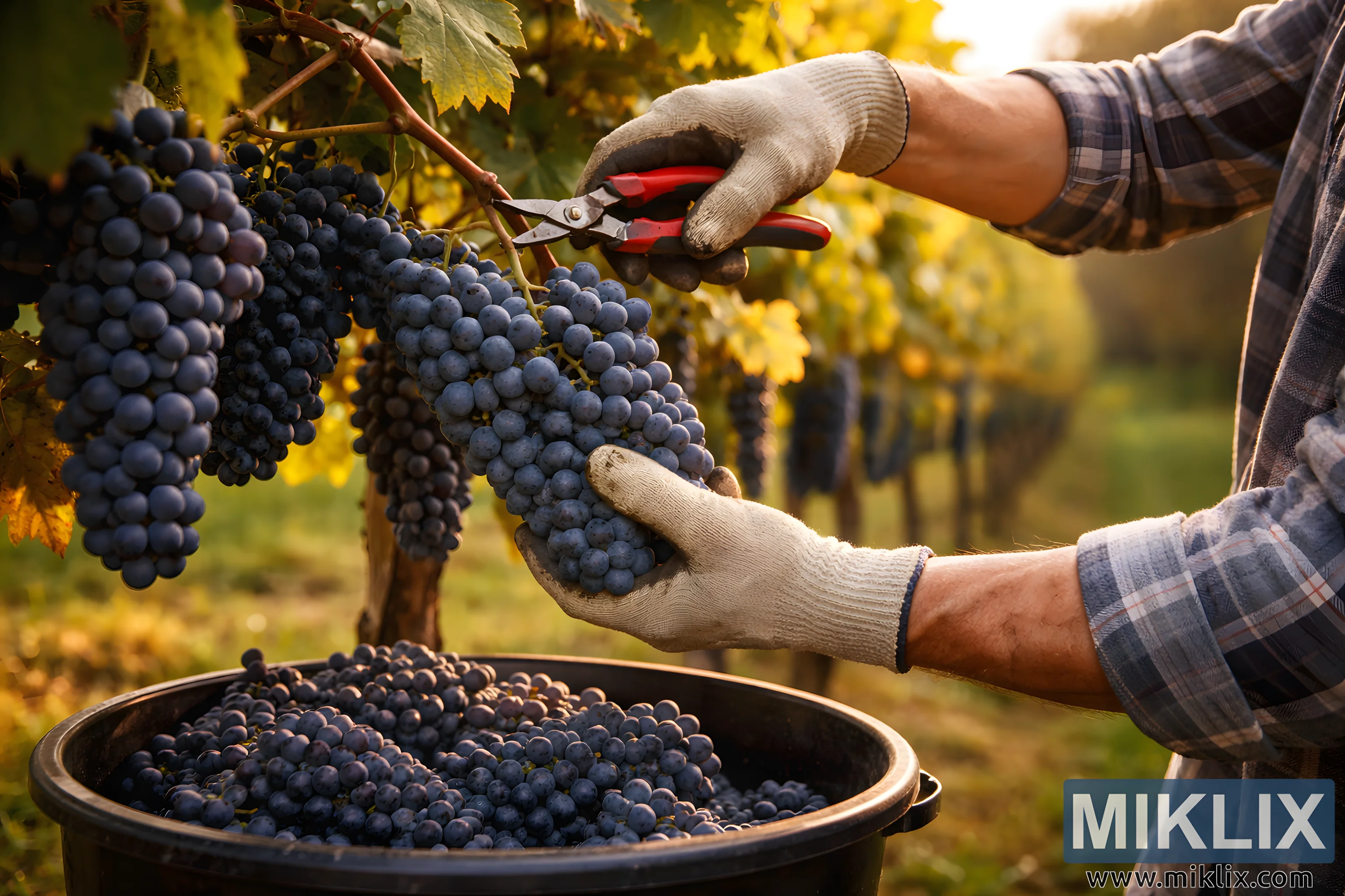 सोनेरी शरद ऋतूतील दुपारी, द्राक्षबागेतील कामगार छाटणीच्या कातरांनी पिकलेल्या द्राक्षांच्या घडांची काळजीपूर्वक कापणी करतानाचा क्लोज-अप फोटो.
