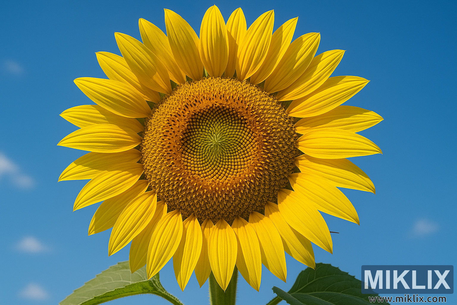 पार्श्वभूमीतील आकाश शुद्ध, संतृप्त निळे आहे ज्यामध्ये फक्त पांढऱ्या ढगांचे हलकेच संकेत आहेत, जे सूर्यफुलाच्या उबदार, सोनेरी रंगांच्या विरुद्ध परिपूर्ण विरोधाभासी पार्श्वभूमी म्हणून काम करतात. आकाशाची साधेपणा फुलावरच लक्ष केंद्रित करते, ज्यामुळे प्रत्येक बारकावे - डिस्कच्या फुलांना चिकटलेल्या लहान परागकणांपासून ते पाकळ्यांमधील सूक्ष्म नसांपर्यंत - उल्लेखनीय स्पष्टतेने दिसून येतात. तेजस्वी, थेट सूर्यप्रकाश फुलाला समोरून प्रकाशित करतो, मऊ, नैसर्गिक सावल्या टाकतो ज्या त्याच्या त्रिमितीय स्वरूपावर भर देतात आणि प्रतिमेला खोली आणि वास्तववादाची भावना देतात.