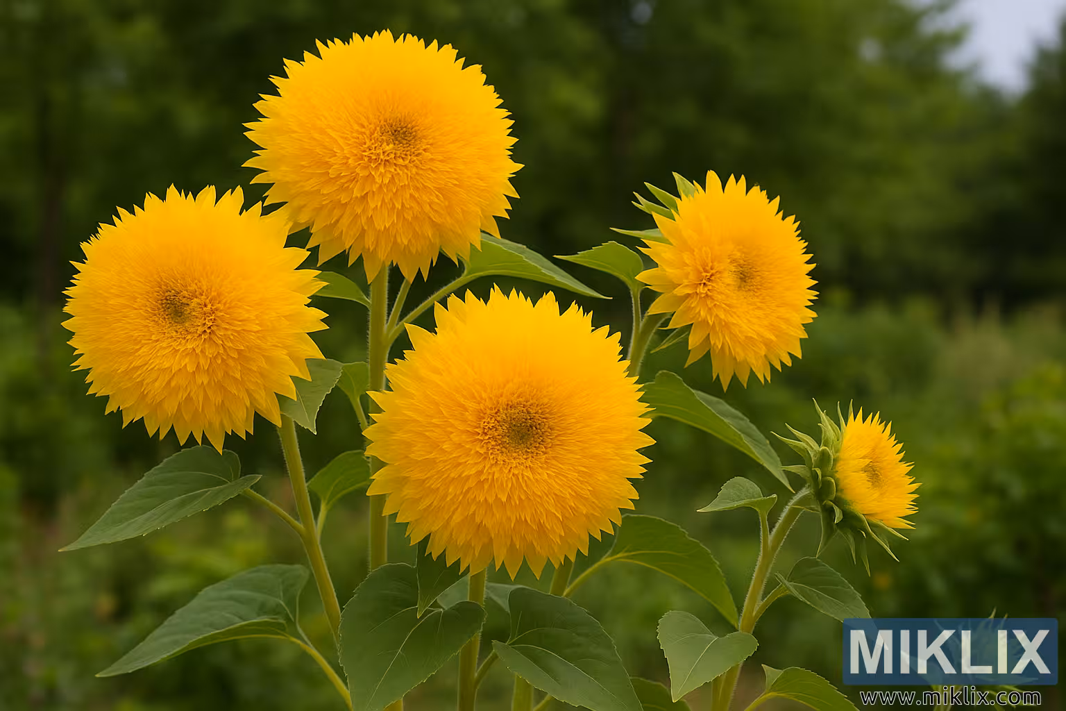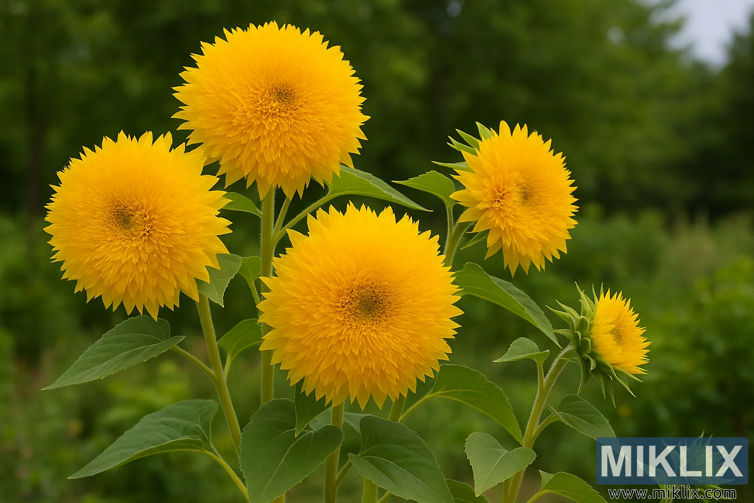 हे उच्च-रिझोल्यूशन छायाचित्र गोल्डी हनी बेअर सूर्यफूल (हेलियनथस अॅन्युअस) चे क्लोज-अप, बागेसारखे चित्र सादर करते जे त्याच्या क्लासिक बहु-स्टेम वाढीच्या सवयीचे प्रदर्शन करते. एकाच वनस्पतीपासून अनेक जाड, पानेदार देठ वरच्या दिशेने फांद्या टाकतात, प्रत्येक एक मऊ, गोलाकार फुलात संपतो जो जवळजवळ सोनेरी पोम-पोमसारखा दिसतो. फुले घनतेने भरलेली असतात लहान, अरुंद किरणे असलेली फुले एका केंद्रित भोवऱ्यात थरलेली असतात, ज्यामुळे एक मऊ, गादीची पोत तयार होते जी गोल्डी हनी बेअरला मानक एकल-पंक्ती सूर्यफूलांपासून वेगळे करते. चमकदार, खुल्या सावलीच्या उन्हाळ्याच्या प्रकाशात आंघोळ केलेली, फुले मधुर पिवळ्या आणि उबदार सोनेरी रंगाच्या संतृप्त टोनमध्ये चमकतात, सर्वात आतल्या फुलांनी किंचित खोल, सूर्य-चुंबन घेतलेला गाभा बनवला आहे.