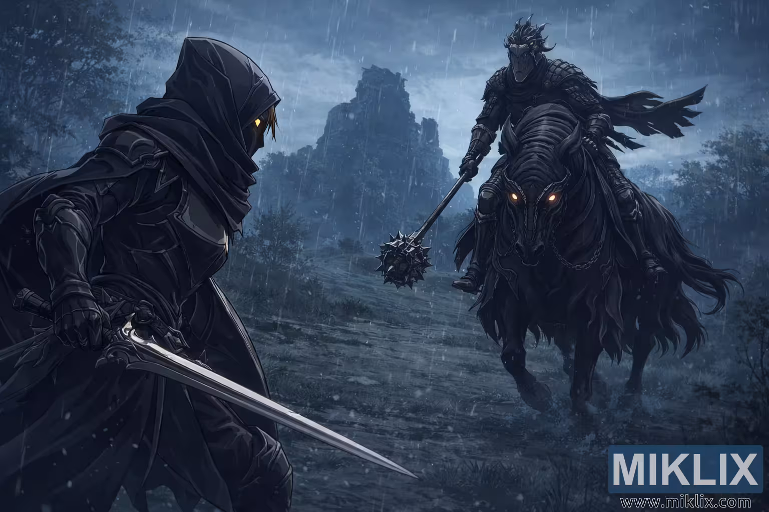 एल्डन रिंगमधील वादळी वीपिंग पेनिन्सुला येथे टार्निश्ड इन ब्लॅक नाइफ आर्मर आणि नाईटस् कॅव्हलरी बॉस यांच्यातील युद्धापूर्वीच्या तणावपूर्ण संघर्षाचे चित्रण करणारी उच्च-रिझोल्यूशन अॅनिम शैलीची फॅन आर्ट.
