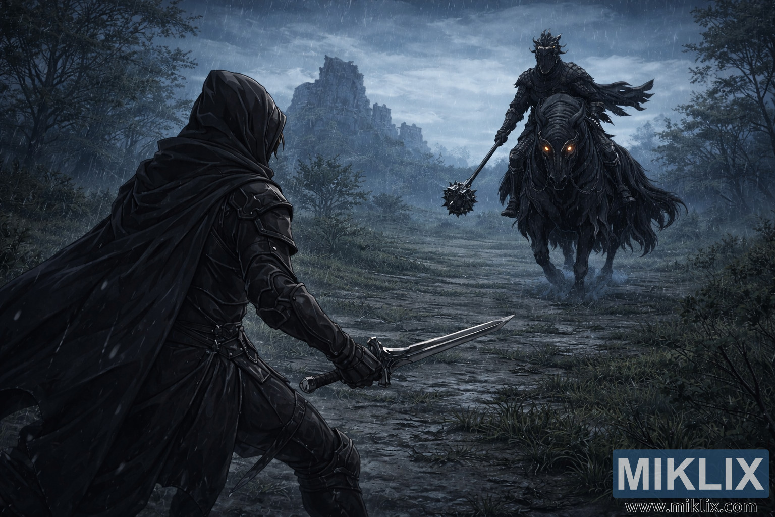विस्तारित पार्श्वभूमीमध्ये एक विस्तीर्ण, पावसाने भिजलेले भूदृश्य दिसते ज्यामध्ये भग्न अवशेष, कोसळलेले दगडी कमानी आणि दूरवर कोसळणारे बुरुज आहेत जे धुक्यात विरघळतात. विरळ, वाऱ्याने वाकलेली झाडे असमान भूभागाच्या तुकड्यांवर चिकटून आहेत, त्यांचे छायचित्र वादळी आकाशावर कोरलेले आहेत. उथळ पाण्याचे तलाव जमिनीवर पसरलेले आहेत, दोन्ही लढाऊ सैनिकांचे विकृत प्रतिबिंब आणि तुटलेल्या वास्तुकलेचे तुकडे प्रतिबिंबित करतात. रंग पॅलेट खोल निळ्या, स्लेट राखाडी आणि मूक चांदीमध्ये जोरदारपणे झुकते, चमकणाऱ्या डोळ्यांमध्ये लहान उबदार उच्चार आणि धातूच्या कडांनी विरामचिन्हे. वर, एक अशांत आकाश दूरवरच्या विजेने प्रकाशित झालेल्या मेघगर्जनांच्या थरांसह मंथन करते, युद्धभूमीवर फिकट प्रकाशाचे क्षणभंगुर प्रभामंडळ टाकते. अद्याप कोणतेही आघात झालेले नाहीत; त्याऐवजी, कलाकृती हिंसाचाराच्या आधीच्या निलंबित क्षणाला कॅप्चर करते, जिथे शांतता, मुद्रा आणि प्रमाण संपूर्ण कथा सांगतात. विस्तृत फ्रेमवर्क द्वंद्वयुद्धाला एकांतता आणि नशिबाच्या भव्य झलकीत रूपांतरित करते, ज्यामध्ये कलंकित आणि रात्रीच्या घोडदळांना केवळ विरोधक म्हणूनच सादर केले जात नाही, तर एका विशाल, उदास जगात उभे असलेल्या दोन गडद व्यक्तिरेखा म्हणून सादर केले जाते जे अविरत पावसात आपला श्वास रोखून धरतात.