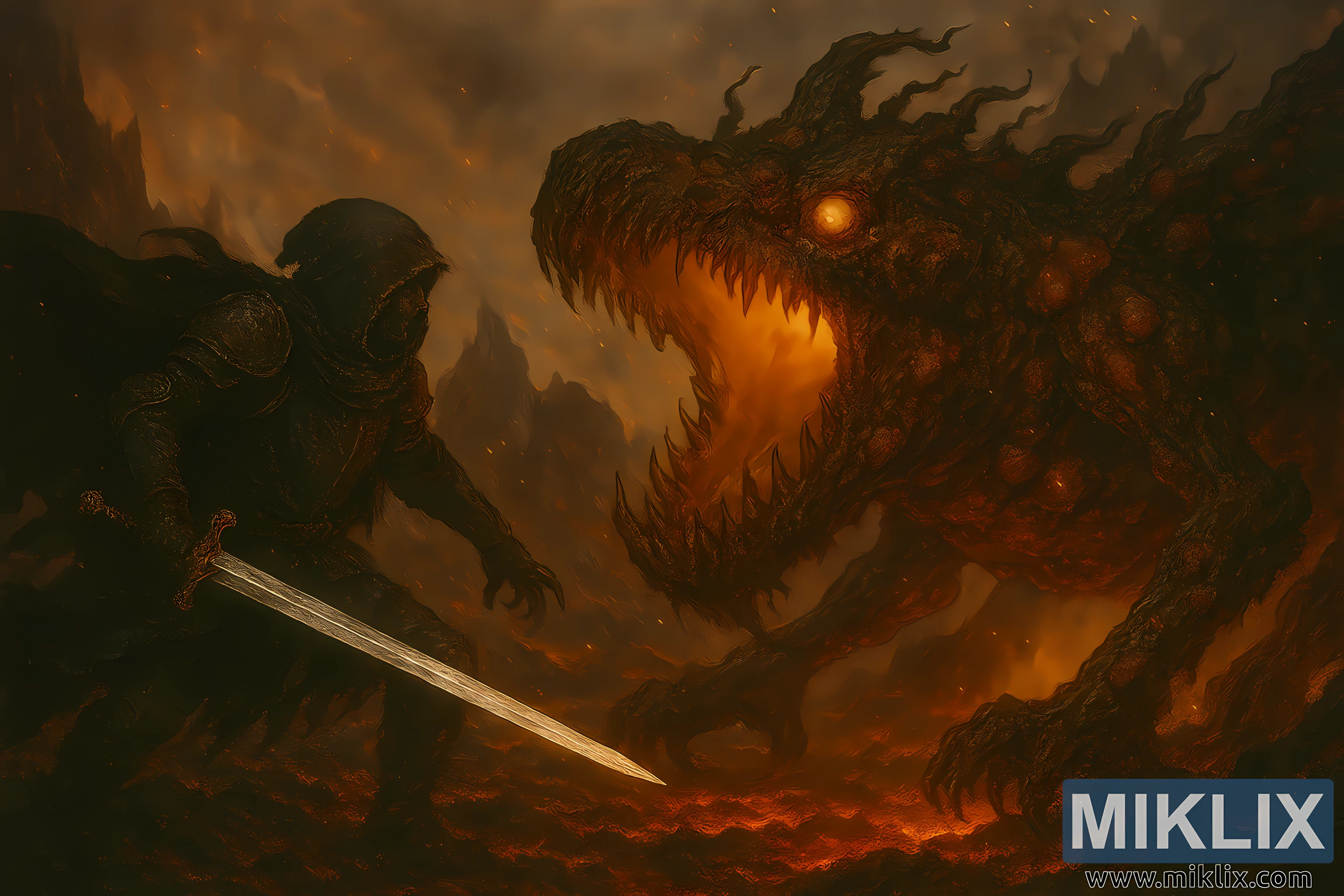 एल्डन रिंगच्या ज्वालामुखी माउंट गेलमीरमध्ये कुजणाऱ्या, व्रणांनी ग्रस्त असलेल्या ट्री स्पिरिटशी झुंजणाऱ्या टार्निश्डची वास्तववादी गडद कल्पनारम्य फॅन आर्ट.