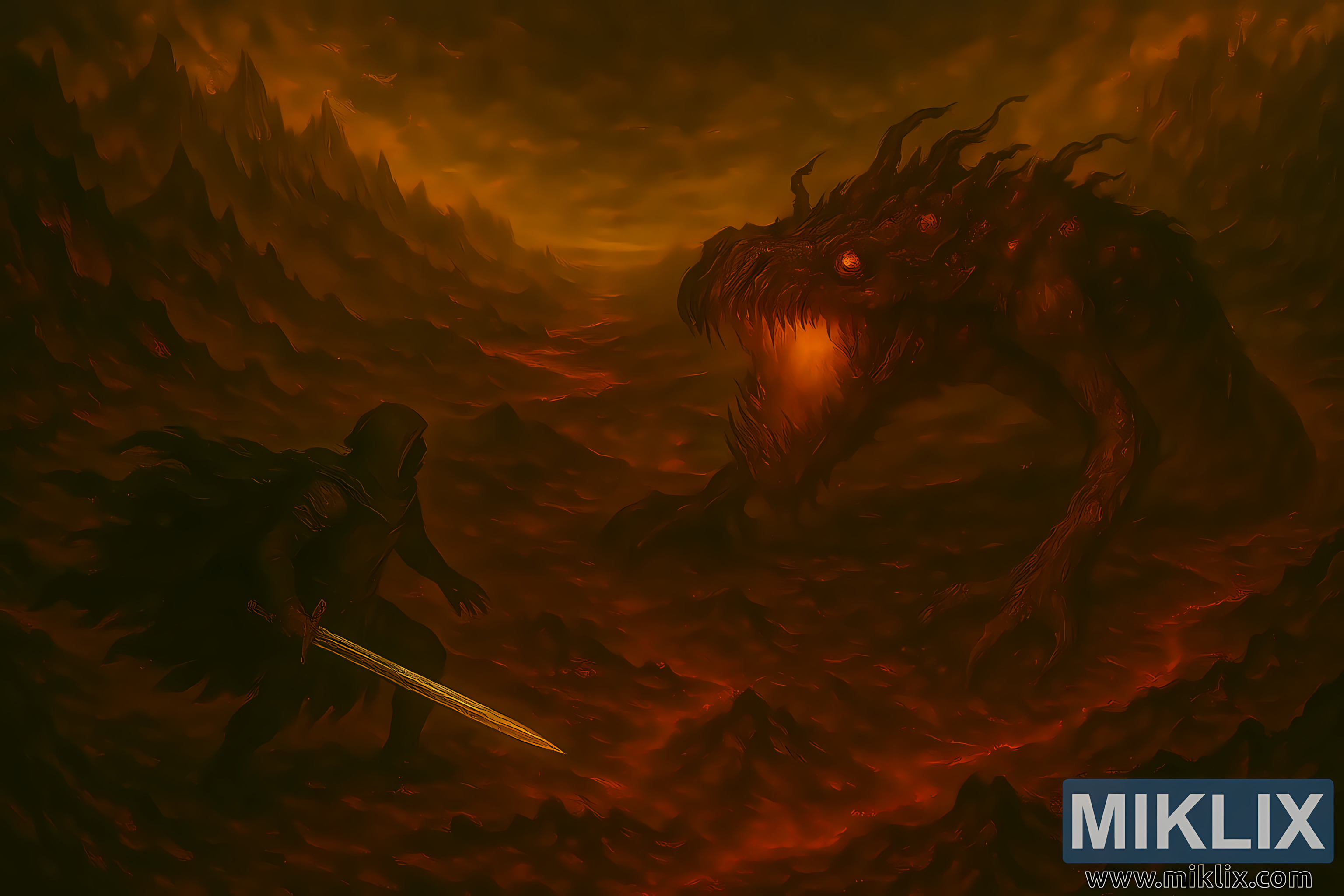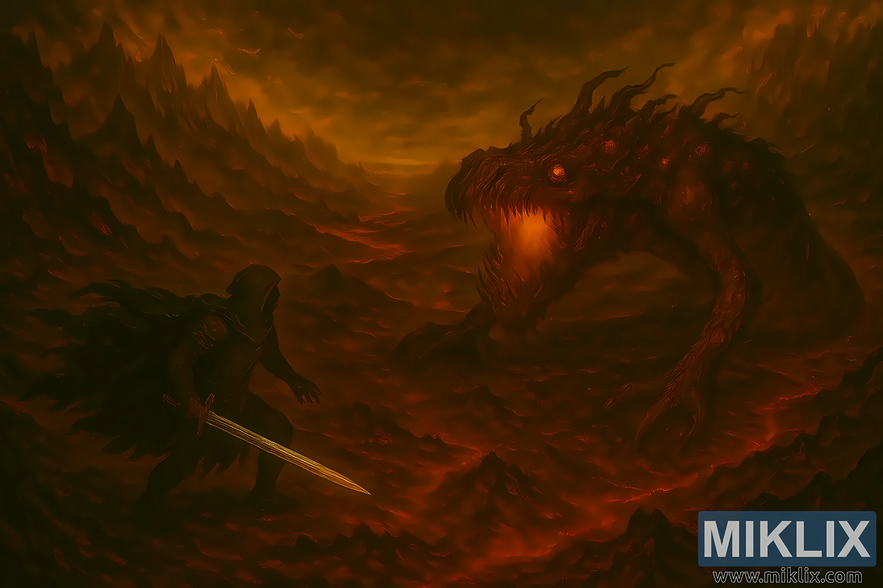 हे चित्रण एल्डन रिंगच्या भयानक सौंदर्याला आदरांजली वाहते, ज्यामध्ये पौराणिक भयपटासह चित्रमय वास्तववादाचे मिश्रण केले आहे. हे क्षय, भ्रष्टाचार आणि अवज्ञा या विषयांना उजाळा देते, गेमच्या सर्वात प्रतिकूल प्रदेशांपैकी एकातील पौराणिक संघर्षाचा क्षण टिपते.