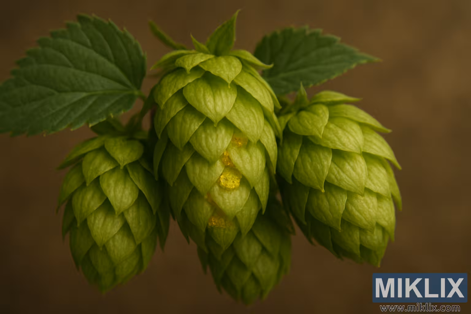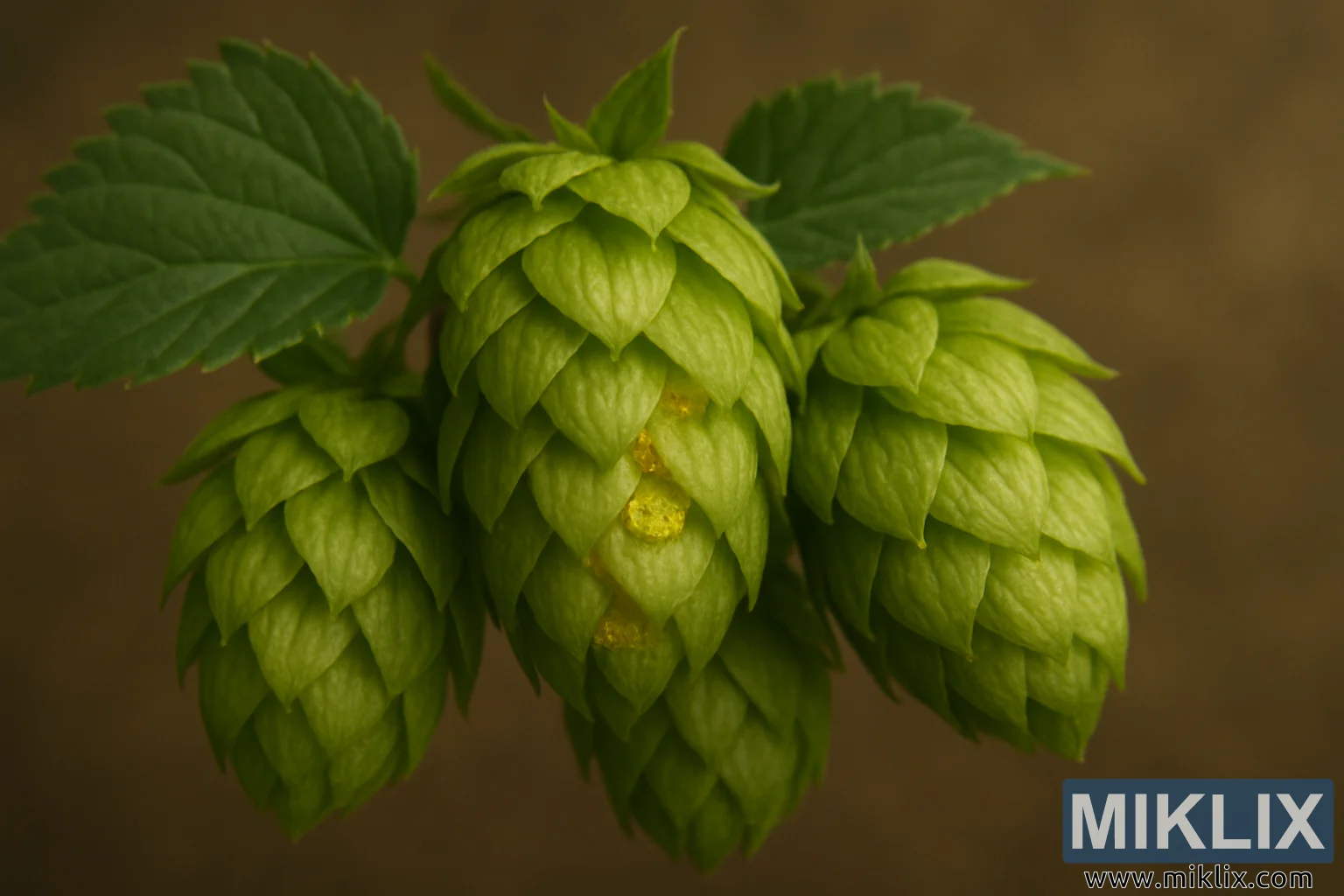 प्रत्येक हॉप शंकू हा सर्पिल पॅटर्नमध्ये व्यवस्थित केलेल्या घट्ट आच्छादित ब्रॅक्ट्सपासून बनलेला असतो, ज्यामुळे त्यांना पाइनकोनसारखे स्वरूप मिळते परंतु अधिक नाजूक आणि कागदी पोत असते. ब्रॅक्ट्स चमकदार हिरव्या असतात, ज्यामध्ये चुना ते खोल मॉस टोनपर्यंत सूक्ष्म फरक असतात. प्रत्येक ब्रॅक्टच्या पृष्ठभागावर बारीक शिरा आणि त्यांच्या पातळ टोकांवर एक मंद, पारदर्शक गुणवत्ता दिसून येते, ज्यामुळे त्यांची नाजूकता दिसून येते. सर्वात आतल्या ब्रॅक्ट्स थोड्याशा ठिकाणी विभाजित होतात ज्यामुळे आत वसलेल्या चमकदार सोनेरी-पिवळ्या ल्युपुलिन ग्रंथी दिसून येतात. या रेझिनस ग्रंथी लहान अंबर थेंबाप्रमाणे चमकतात, जे हॉपच्या ब्रूइंग वैशिष्ट्याची व्याख्या करणाऱ्या समृद्ध सुगंधी तेले आणि कडू संयुगे दर्शवितात. ल्युपुलिनची सोनेरी चमक आसपासच्या हिरव्या ब्रॅक्ट्सच्या तुलनेत आश्चर्यकारकपणे भिन्न आहे, जी शंकूच्या सुगंधी तीव्रतेचे आणि ब्रूइंग क्षमतेचे दृश्य संकेत म्हणून काम करते.