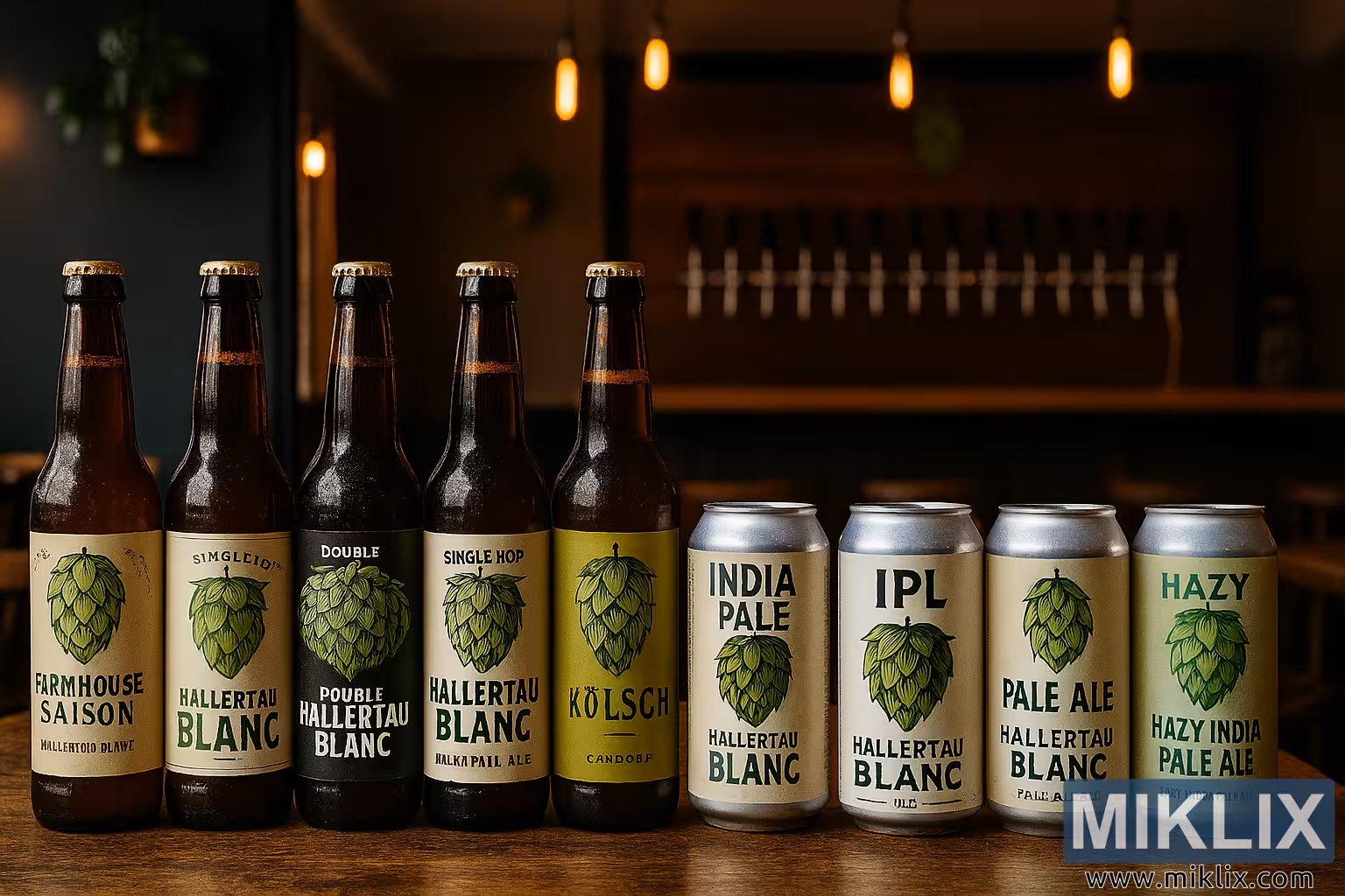 ही उच्च-रिझोल्यूशन लँडस्केप प्रतिमा विविध प्रकारच्या क्राफ्ट बिअर शैलींमध्ये हॅलेर्टाऊ ब्लँक हॉप्सची बहुमुखी प्रतिभा प्रदर्शित करण्यासाठी समर्पित एक उबदार, आकर्षक घरातील दृश्य कॅप्चर करते. अग्रभागी, एका ग्रामीण लाकडी टेबलावर नऊ वेगवेगळ्या बिअर आहेत - पाच तपकिरी काचेच्या बाटल्या आणि चार अॅल्युमिनियम कॅन - प्रत्येकावर हॅलेर्टाऊ ब्लँक हॉप प्रकाराचे ठळकपणे लेबल केलेले आहे. लेबल्समध्ये हिरव्या रंगाच्या छटा दाखवलेल्या हॉप चित्रे आहेत, ज्यात फार्महाऊस सायसन, कोल्श, पेल अले, हेझी आयपीए, डबल आयपीए आणि इंडिया पेल लागर यासारख्या बिअर शैलीची ओळख पटवणाऱ्या ठळक टायपोग्राफीसह जोडलेले आहे. ही व्यवस्था सममितीय आणि जाणीवपूर्वक आहे, दृश्य सुसंवाद राखताना शैलींच्या विविधतेवर भर देते.