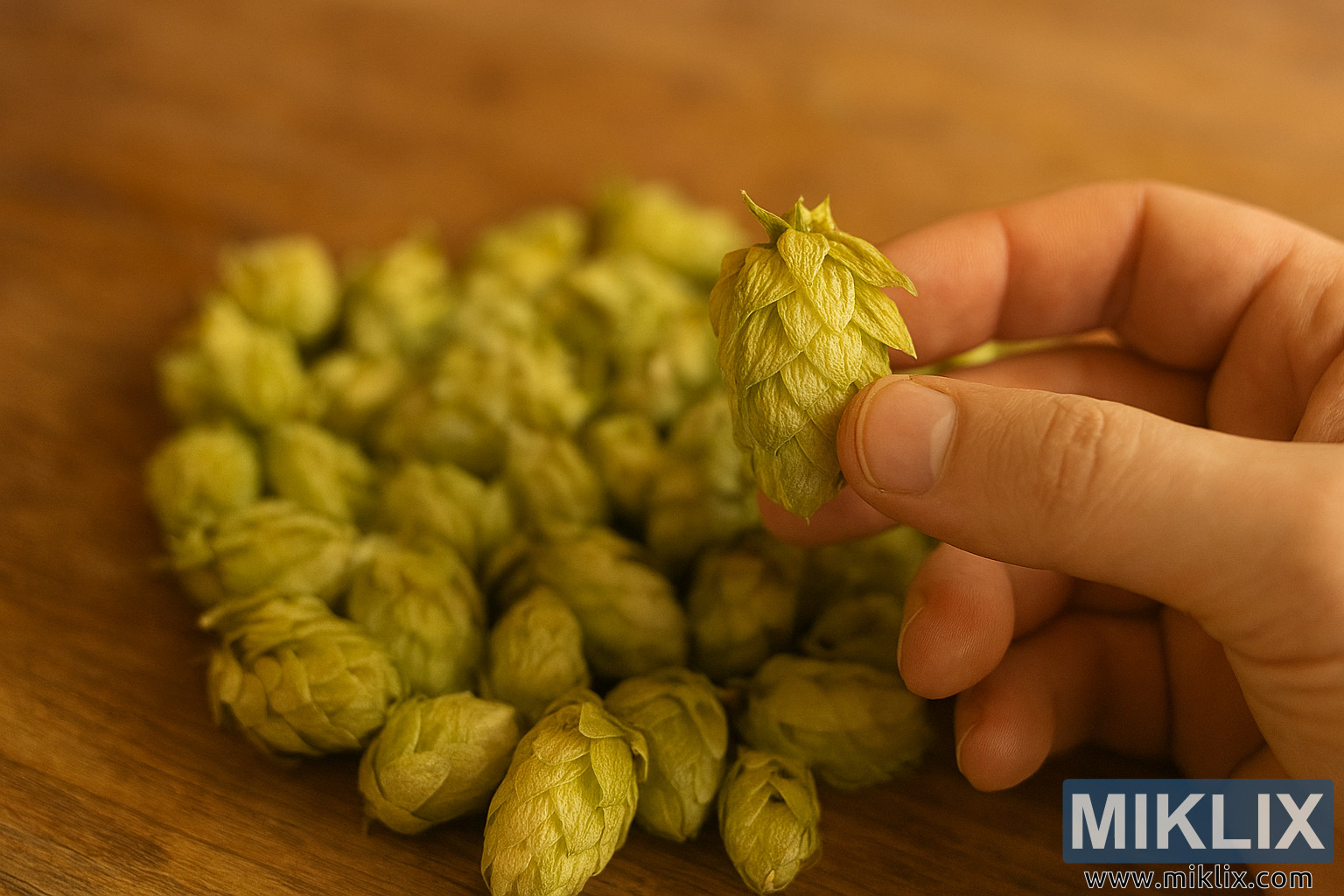पार्श्वभूमीत, अशाच प्रकारच्या हॉप कोनचा ढीग एका उबदार रंगाच्या लाकडी पृष्ठभागावर आहे. हे कोन आकार आणि आकारात थोडेसे बदलतात आणि जरी ते लक्ष केंद्रित नसले तरी, ते एक समृद्ध, सेंद्रिय संदर्भ प्रदान करतात जे दृश्याच्या ग्रामीण आणि कलात्मक मूडला बळकटी देतात. लाकडी दाणे दृश्यमान आहेत आणि क्षैतिजरित्या चालतात, त्याचे उबदार तपकिरी रंग हॉप्सच्या सोनेरी-हिरव्या रंगछटांना पूरक आहेत. पार्श्वभूमी हळूवारपणे मऊ अस्पष्टतेत फिकट होते, ज्यामुळे पाहणाऱ्याचे लक्ष हातावर आणि हॉप कोनवर राहते.