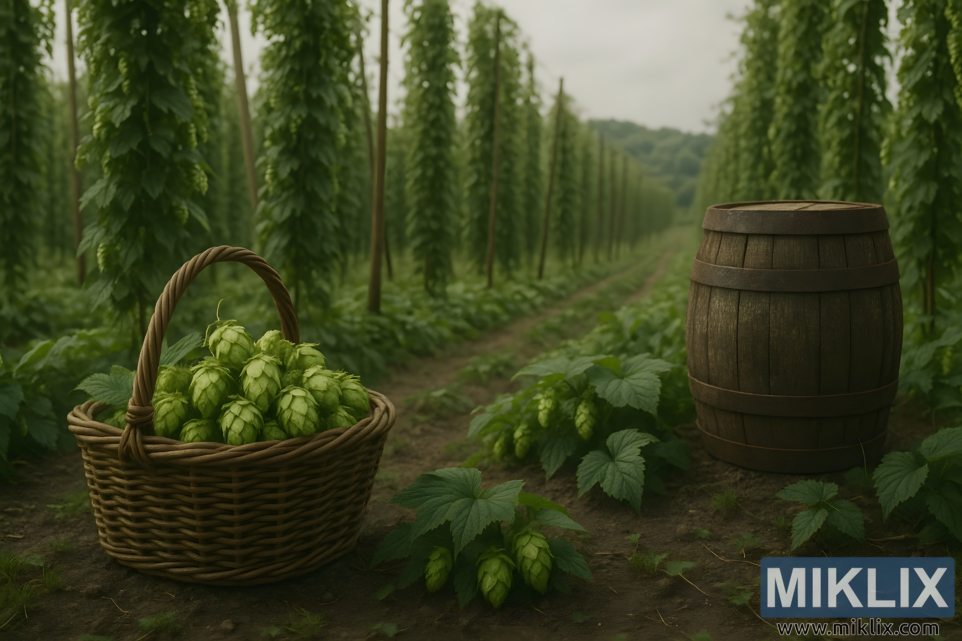 टोपलीच्या बाजूला एक ओक वृक्षाची वाळलेली बॅरल आहे, ज्याच्या दांड्यावर वर्षानुवर्षे, जरी दशके नसली तरी, वापराच्या सूक्ष्म खुणा आहेत. बॅरल ही केवळ उपयुक्त वस्तू नाही - ती शेती आणि हस्तकला यांच्यातील सातत्य, कच्चे कापणी आणि शुद्ध पेय यांच्यातील दुव्याचे प्रतीक आहे. त्याच्या जीर्ण लाकडावर भूतकाळातील असंख्य ब्रूची कहाणी कोरलेली आहे, एका अशा उपकरणाची शांत सहनशक्ती जी हॉप्सइतकीच ब्रूइंगसाठी महत्त्वाची आहे. शेतात त्याची उपस्थिती श्रम आणि बक्षीसाच्या चक्रांची आठवण करून देते: शंकू लवकरच वाळवले जातील, प्रक्रिया केले जातील आणि साठवले जातील, काही माल्ट आणि यीस्टसह किण्वनासाठी नियत असतील, तर काही कदाचित भविष्यातील वापरासाठी पॅक केले जातील. या क्षणी, बॅरल तयारी आणि संयम दोन्ही दर्शवते, कापणीची तात्काळता आणि ब्रूइंग आणि परिपक्वतेच्या दीर्घ कामातील पूल.