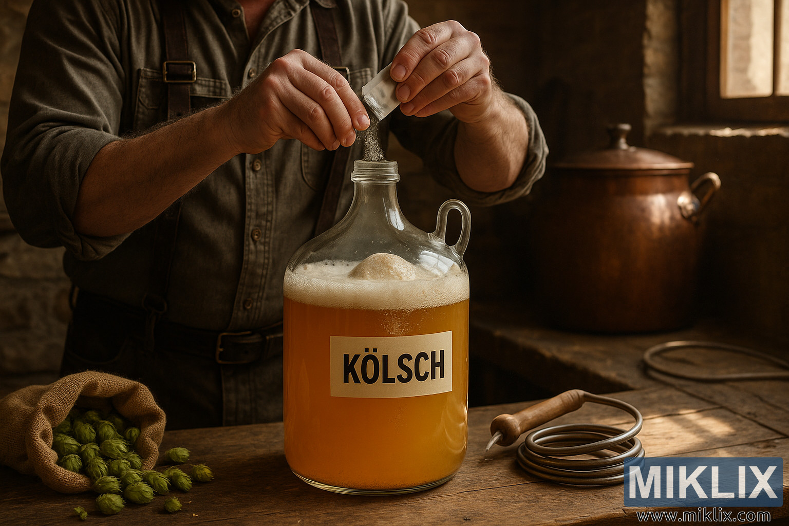 ही प्रतिमा होमब्रूइंग प्रक्रियेतील एक जिव्हाळ्याचा आणि प्रामाणिक क्षण टिपते - एक जर्मन होमब्रूअर कोल्श-शैलीतील बिअरने भरलेल्या फर्मेंटरमध्ये कोरडे यीस्ट ओततो. हे दृश्य एका ग्रामीण, उबदार प्रकाश असलेल्या ब्रूइंग जागेत उलगडते जे कारागिरी आणि परंपरा दोन्ही पसरवते. मध्यवर्ती व्यक्तिरेखा, मजबूत, कामाने थकलेले हात असलेला एक मध्यमवयीन माणूस, एका मोठ्या काचेच्या कार्बॉयच्या तोंडात कोरड्या यीस्टचे पॅकेट ओतताना मध्यभागी चित्रित केला आहे. त्याचा पोशाख, गुंडाळलेल्या बाही आणि गडद सस्पेंडरसह राखाडी लिनेन शर्ट, कालातीततेची भावना जागृत करतो, या कलाकृतीला अशाच ठिकाणी समान विधी करणाऱ्या ब्रूइंग उत्पादकांच्या पिढ्यांशी जोडतो.