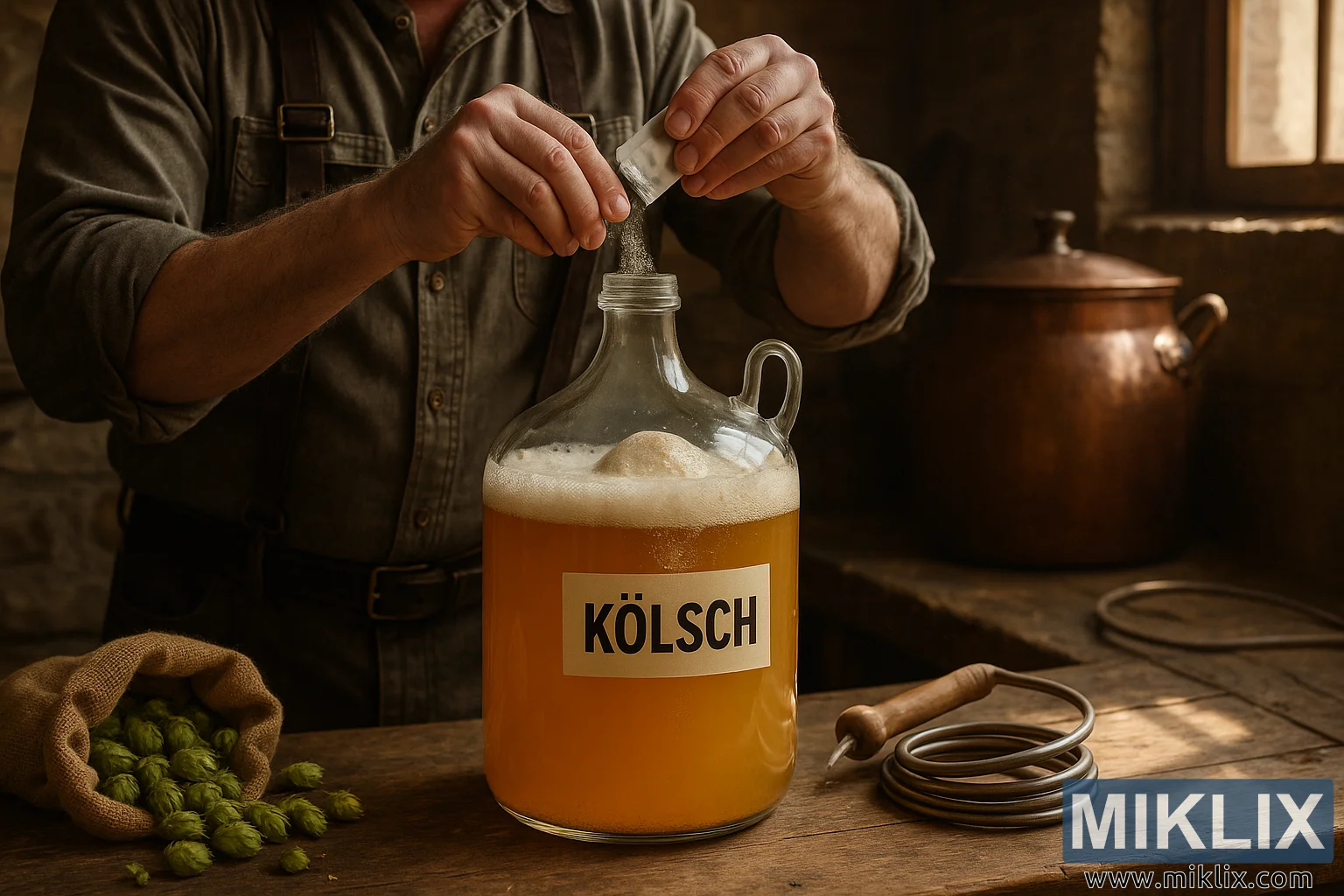 एका उबदार प्रकाश असलेल्या ग्रामीण कार्यशाळेत, एक जर्मन होमब्रूअर कोल्श-शैलीतील बिअरने भरलेल्या काचेच्या फर्मेंटरमध्ये कोरडे यीस्ट ओततो. लाकडी पोत, तांबे ब्रूइंग साधने आणि नैसर्गिक प्रकाश एक कालातीत, प्रामाणिक ब्रूइंग वातावरण तयार करतात.