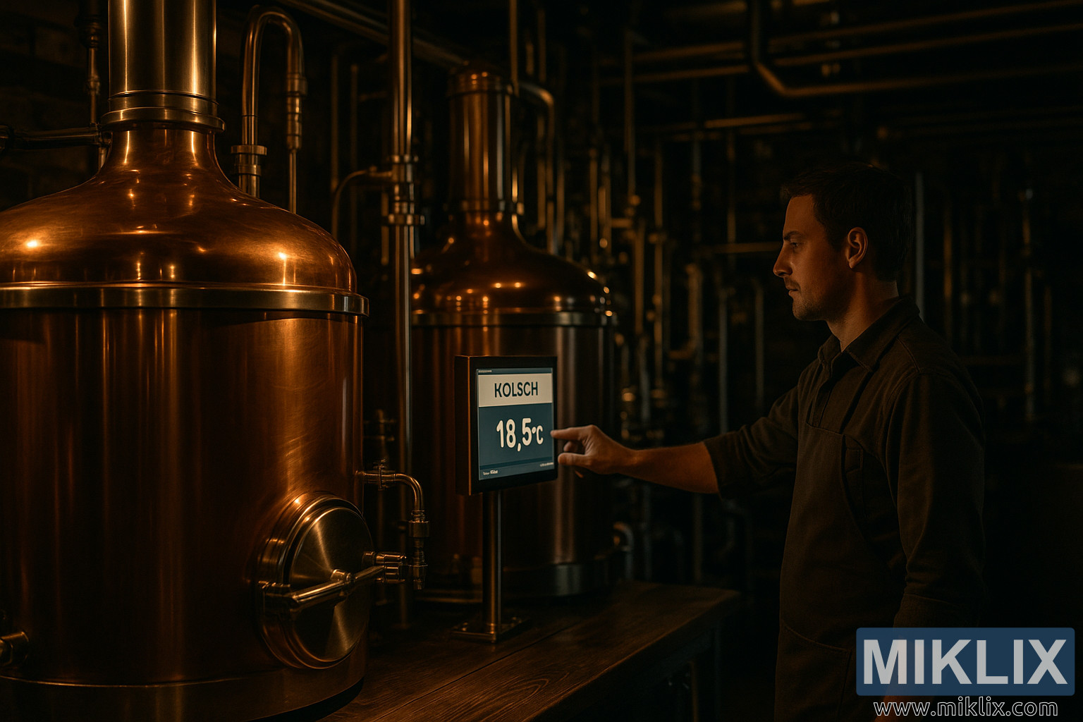 उबदार प्रकाश असलेल्या ब्रुअरीच्या आत, एक तंत्रज्ञ चमकदार तांब्याच्या टाक्यांजवळील डिजिटल डिस्प्लेवर कोल्श किण्वन तापमानाचे अचूक निरीक्षण करतो, ज्याभोवती पाईप्स आणि ब्रुअरिंग उपकरणांचे एक गुंतागुंतीचे जाळे असते.