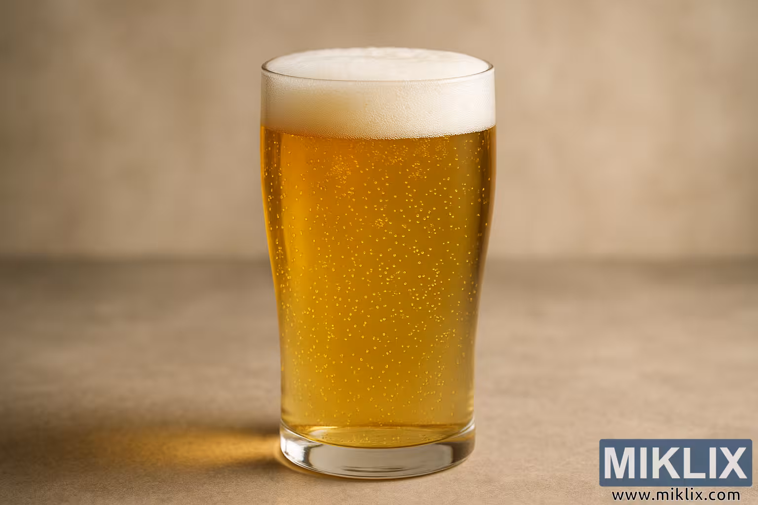 दृश्यातील प्रकाशयोजना मऊ आणि पसरलेली आहे, जी विषयाला जास्त प्रभावित न करता पोत आणि खोलीवर भर देते. सौम्य हायलाइट्स काचेच्या कडा आणि वक्रतेवरून चमकतात, तर सूक्ष्म सावल्या त्याच्या पायाला आच्छादित करतात, नैसर्गिकरित्या तटस्थ-टोन केलेल्या पृष्ठभागावर जमिनीवर ठेवतात. पार्श्वभूमी - बेज आणि उबदार राखाडी रंगाचा एक गुळगुळीत, मऊ अस्पष्ट ग्रेडियंट - एक बिनधास्त टप्पा प्रदान करते ज्यामुळे बिअरचा दोलायमान रंग आणि उत्स्फूर्तता पूर्ण दृश्य नियंत्रणात येऊ शकते. एकूण रचना किमान आहे परंतु खोलवर वातावरणीय आहे, जी दर्शकाला केवळ बिअरने सुचवलेल्या संवेदी अनुभवावर लक्ष केंद्रित करण्यास आमंत्रित करते.