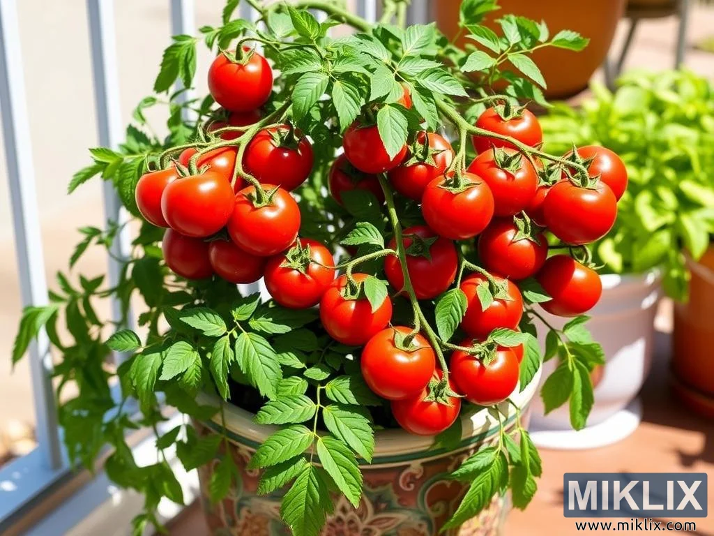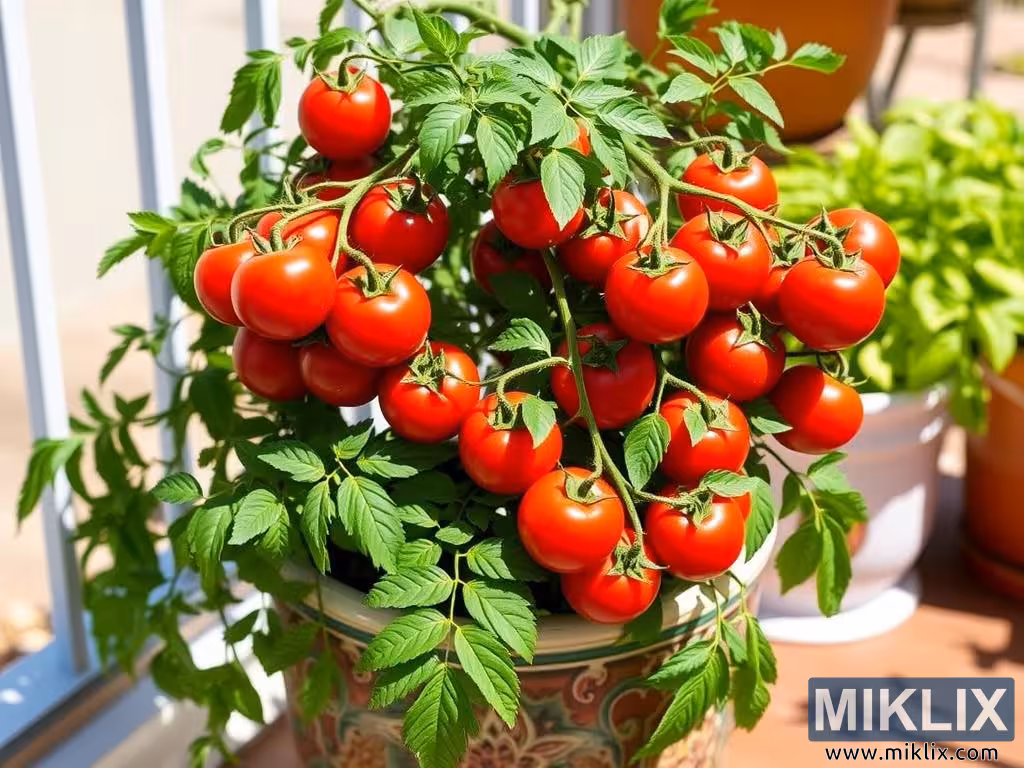 Imej ini merakamkan intipati bersemangat berkebun kontena yang paling bermanfaat, mempamerkan tumbuhan tomato yang berkembang pesat yang berdiri sebagai pusat visual dan bukti penanaman bandar yang berjaya. Terletak di dalam pasu hiasan yang berhias, tumbuhan itu bangkit dengan daya hidup yang yakin, batangnya bercabang ke luar dan ke atas untuk menyokong banyak tomato merah yang masak. Buah-buahan berkelompok dengan banyaknya di sepanjang pokok anggur, permukaannya yang bulat dan berkilat berkilauan dalam cahaya, setiap satunya adalah sfera kematangan yang sempurna. Warnanya kaya dan seragam, daripada merah tua hingga merah ceri terang, menunjukkan kematangan puncak dan profil rasa yang menjanjikan kemanisan, keasidan dan juicy dalam setiap gigitan.