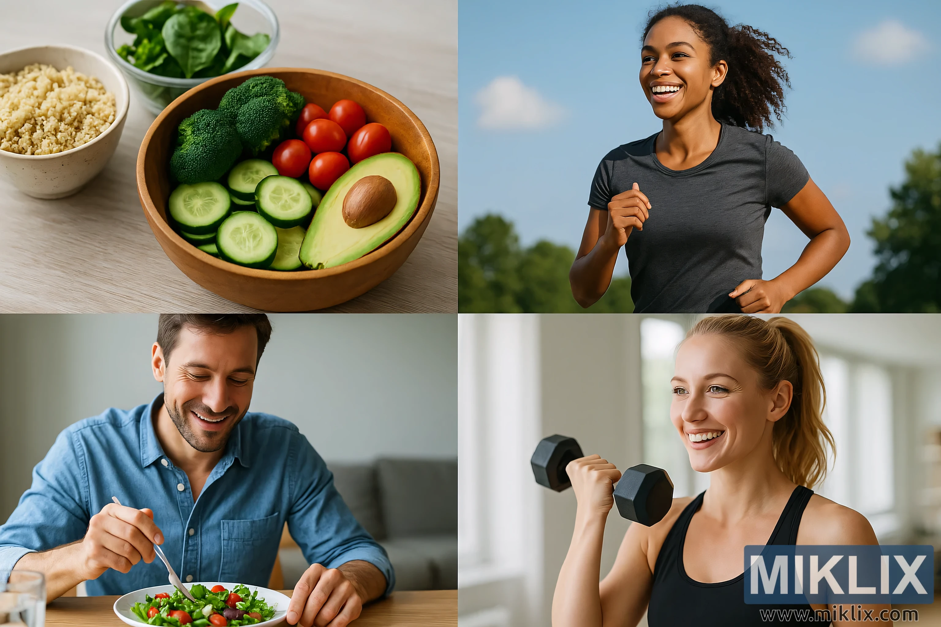 Kolaj empat bahagian yang menunjukkan pemakanan seimbang dengan makanan segar dan kehidupan aktif melalui jogging dan latihan kekuatan untuk kesejahteraan keseluruhan.