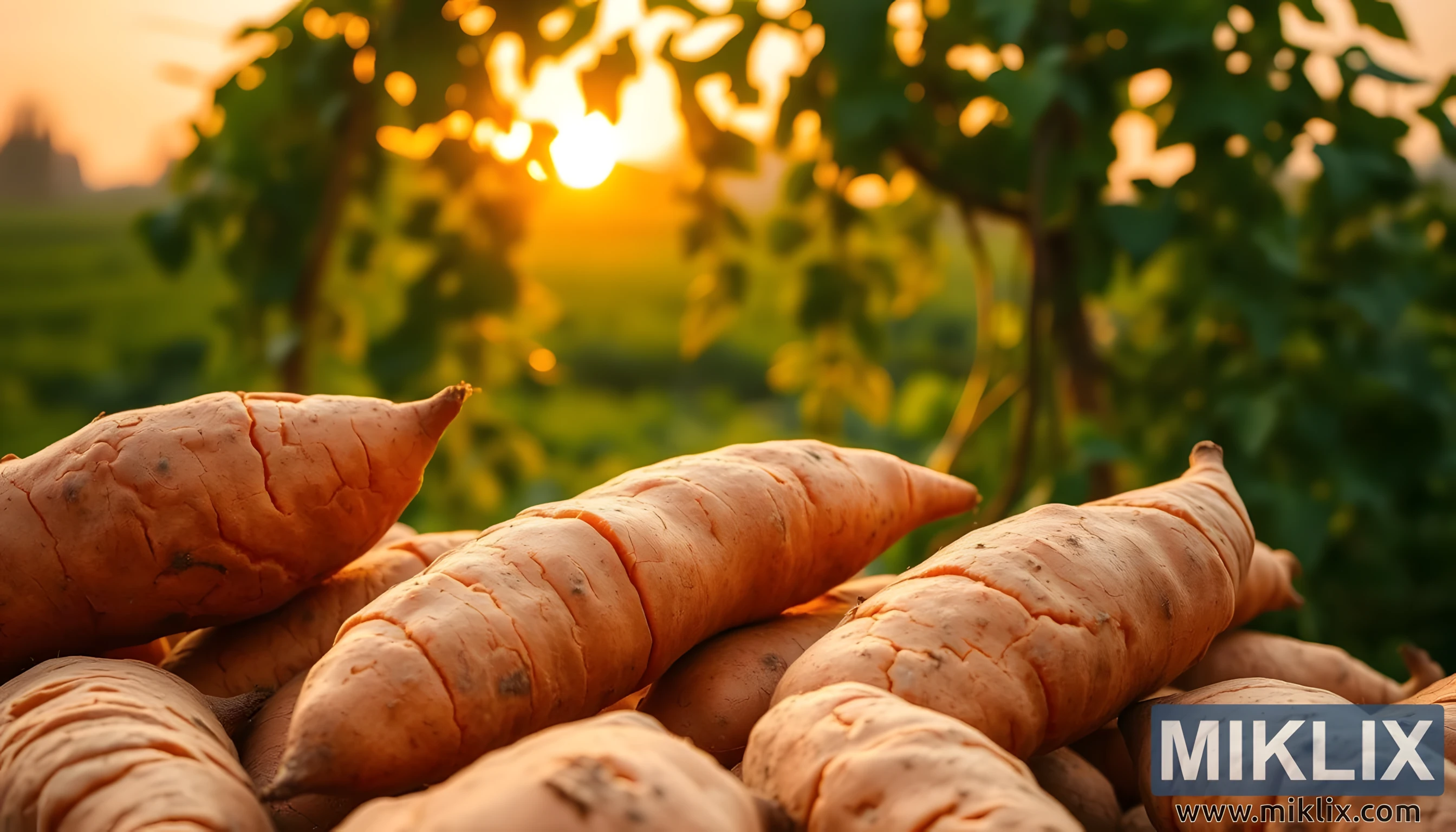 Imej itu terungkap seperti perayaan pastoral kelimpahan alam semula jadi, meletakkan ubi keledek di tengah-tengah tablo yang diterangi matahari yang memancarkan kehangatan, khasiat dan kesederhanaan abadi. Di latar depan, ubi-ubi itu terletak di dalam longgokan yang lembut, kulit tanah mereka terukir dengan rabung, alur, dan tanda-tanda halus pertumbuhannya di bawah tanah. Permukaan mereka disinari oleh sinaran keemasan matahari terbenam, yang membasuhnya dalam cahaya ambar yang hangat, menyerlahkan tekstur semula jadi dan keindahan organik bentuknya yang sedikit tidak teratur. Ton kulit berbeza-beza daripada warna oren pucat, berdebu kepada warna yang lebih dalam, lebih bersemangat, peringatan tentang kepelbagaian yang wujud dalam persembahan alam semula jadi. Keakraban dan perincian ini menggalakkan bukan sahaja kekaguman tetapi penghargaan sentuhan, seolah-olah seseorang boleh menjangkau ke hadapan dan merasakan permukaan kasar, sedikit kering akar yang baru dituai, masih membawa bersama mereka kisah tanah.